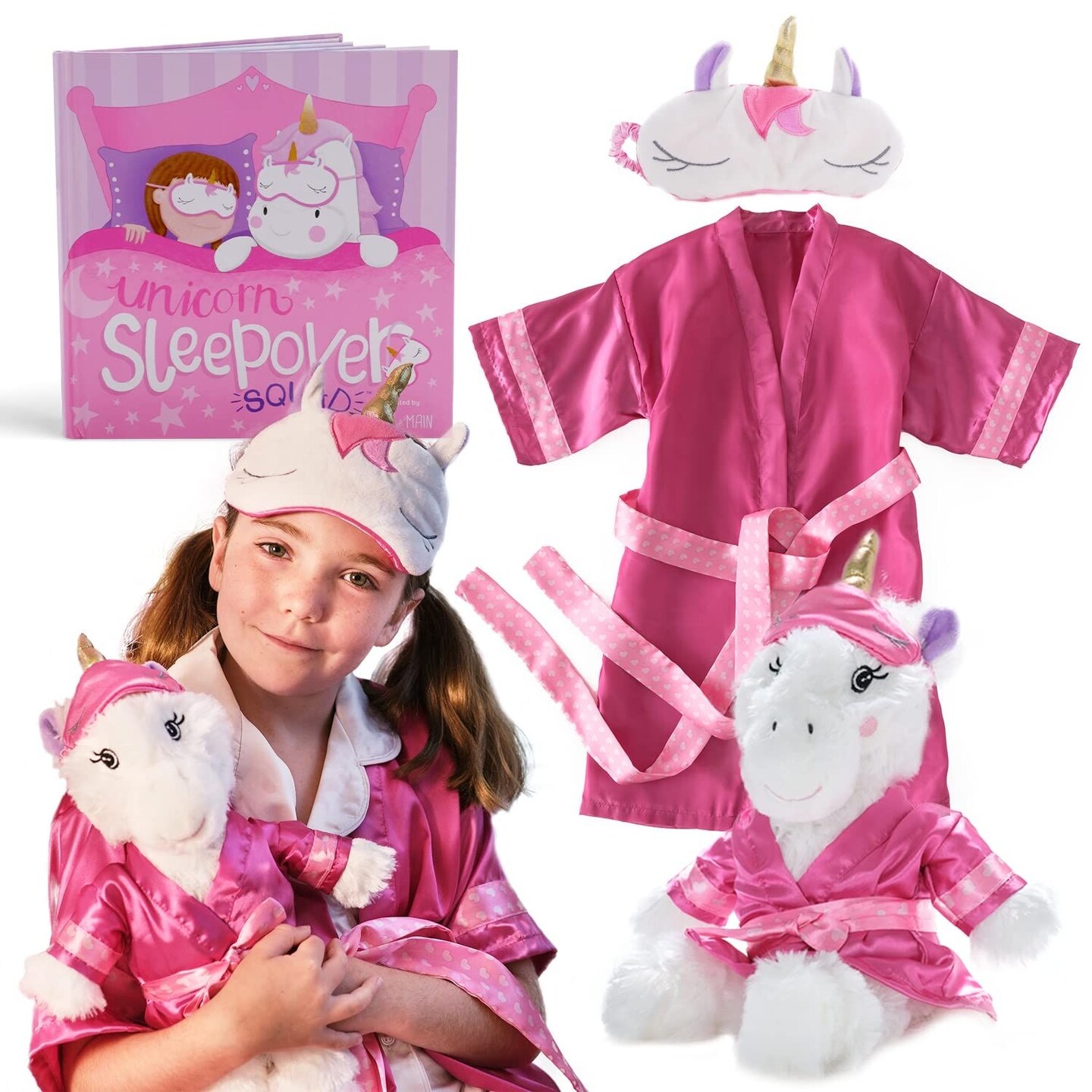 Tickle & Main 4 Pieces Unicorn Gift Sets for Girls Age 3 or Up, with Pink Robe, Sleeping Mask, Animal Plushie Toy and Storybook Set