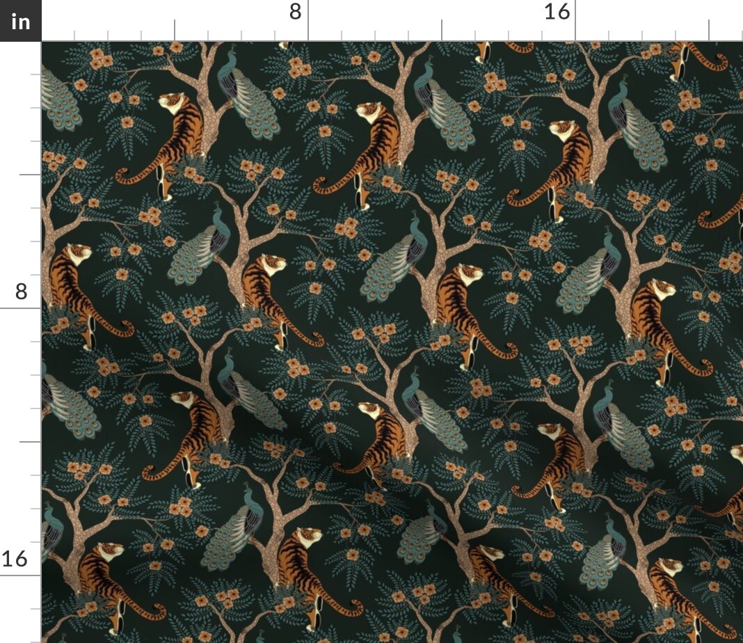 Tiger Peacock Small Scale Bird Asian Flowers Floral Chinese Tree Dark Custom Printed Fabric by Spoonflower Various Fabrics by the Yard or Fat Quarter