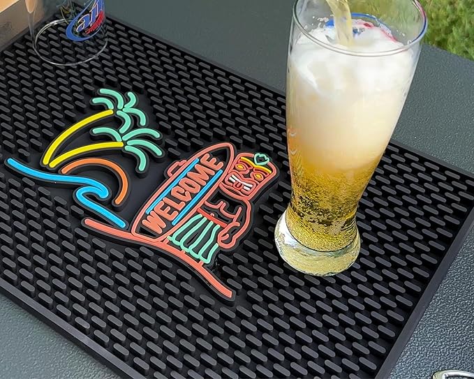 Tiki Bar Mats for Countertop 18 x 12 Tiki Bar Decor Mat Unique Tiki Man Warrior Design, Surfboard Welcome Greeting, Wave, Palm Tree, and Sunset Tiki Decor, Outdoor Tiki Bar Sign and Luau Party Decorations