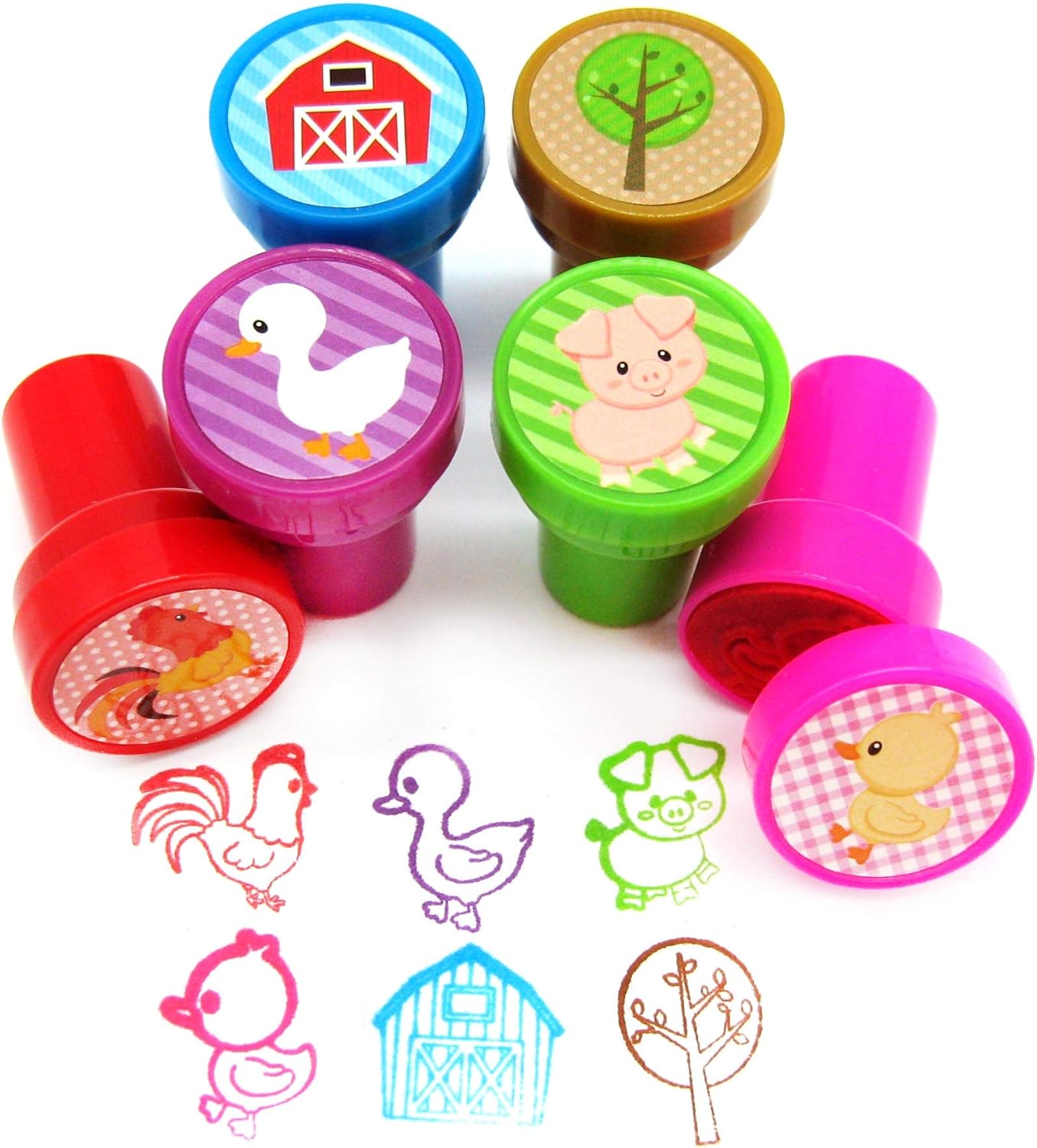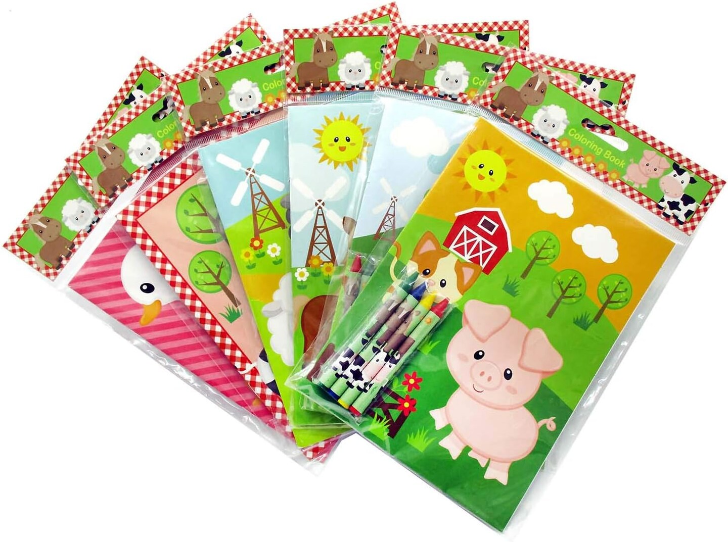 Tiny Mills Barnyard Animals Birthday Party Assortment Favor Set 108 pcs (12 Large Party Favor Treat Bags with Handles, 24 Self-Ink Stamps for Kids, 12 Sticker Sheets, 12 Coloring Books, 48 Crayons)