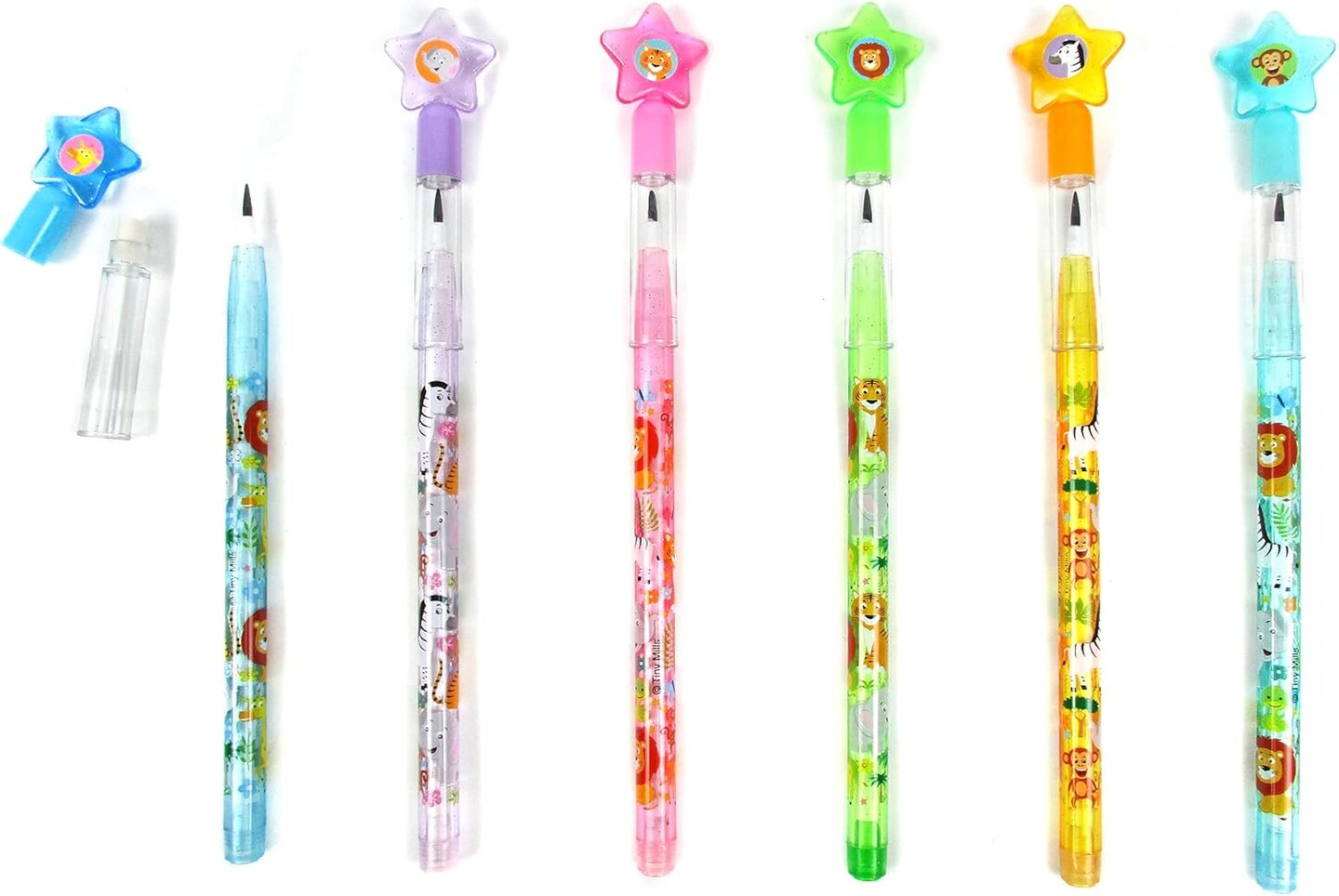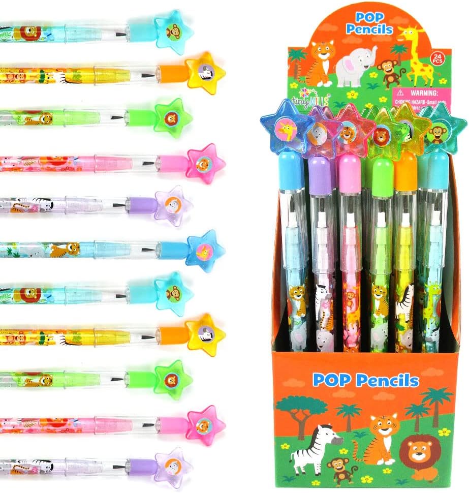 TINYMILLS 24 Pcs Safari Jungle Animals Stackable Push Pencil Assortment with Eraser for Party Favors Goodie Bag Stuffers VBS Classroom Rewards Pinata Fillers Carnival Prize