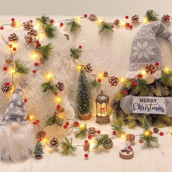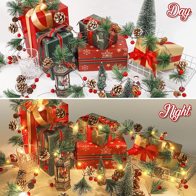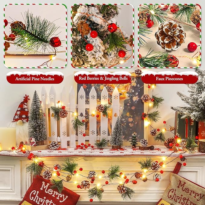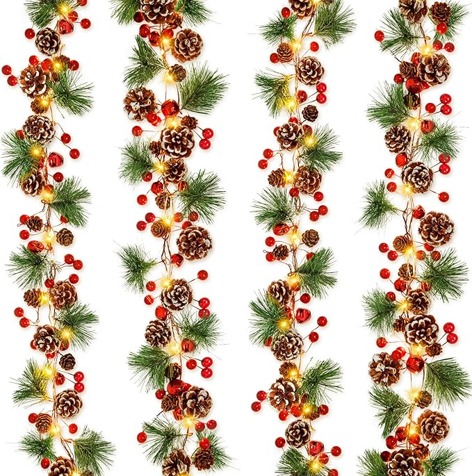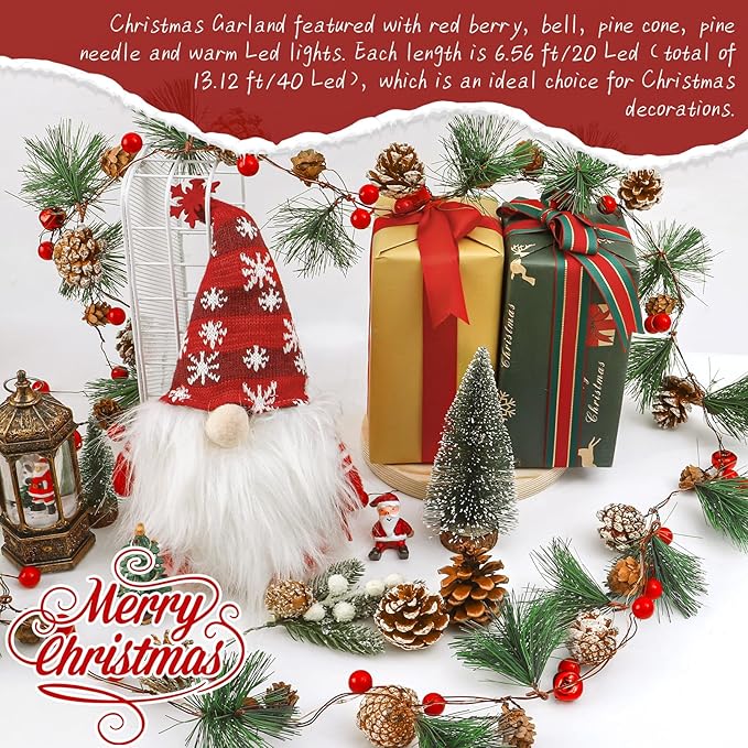 Total 13.2 Ft 40 Led Lighted Christmas Garland Battery Operated with Red Berry Bells Pine Needles for Home Fireplace Mantel Lighted Garland Decor
