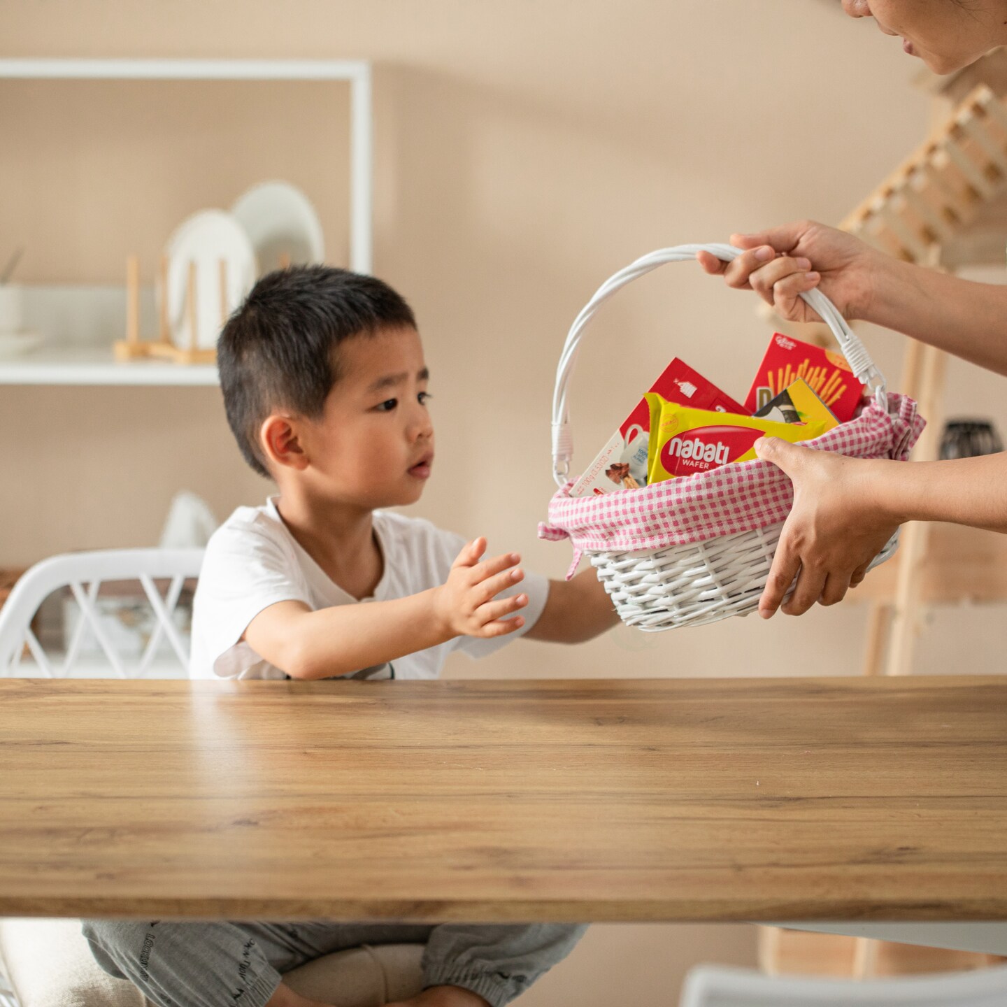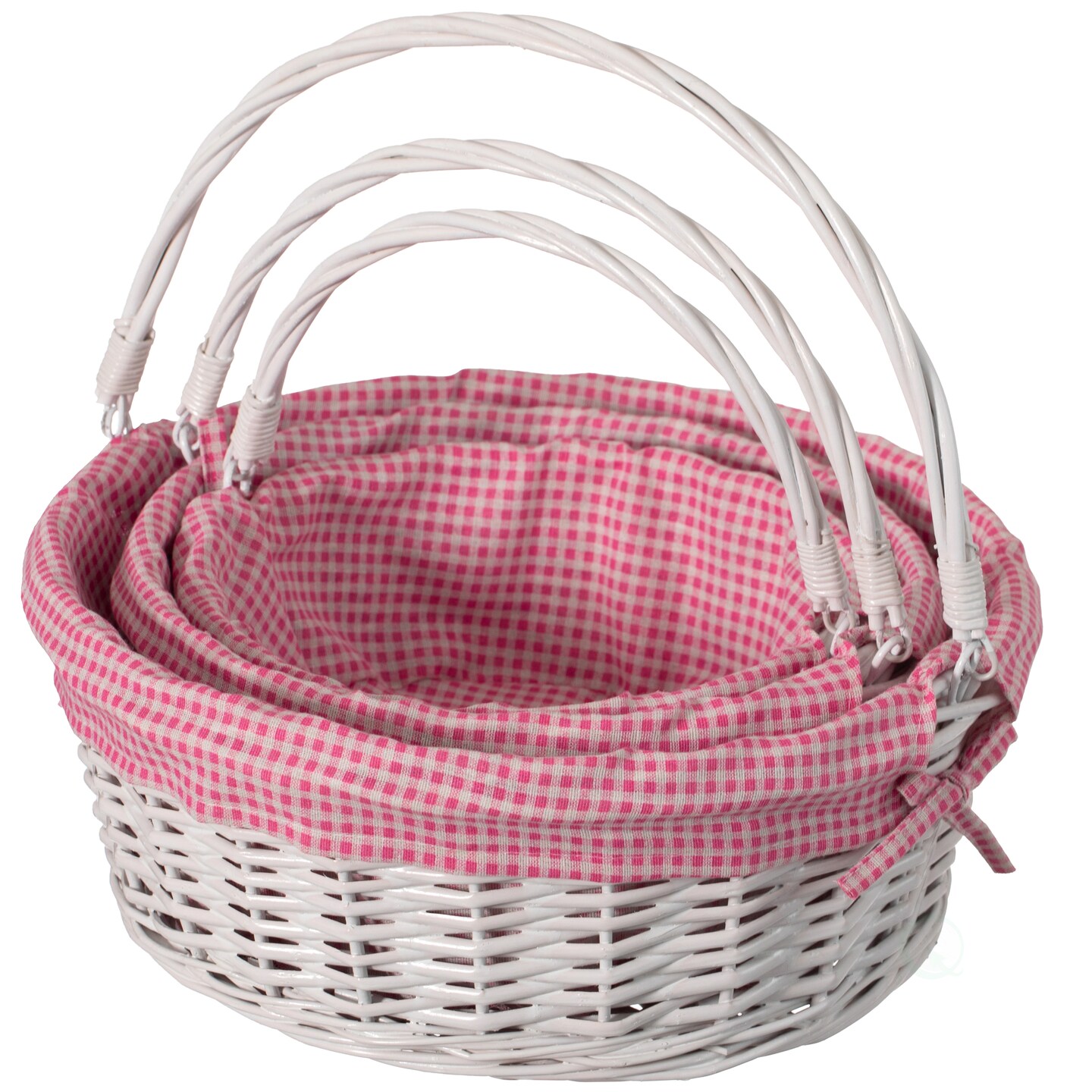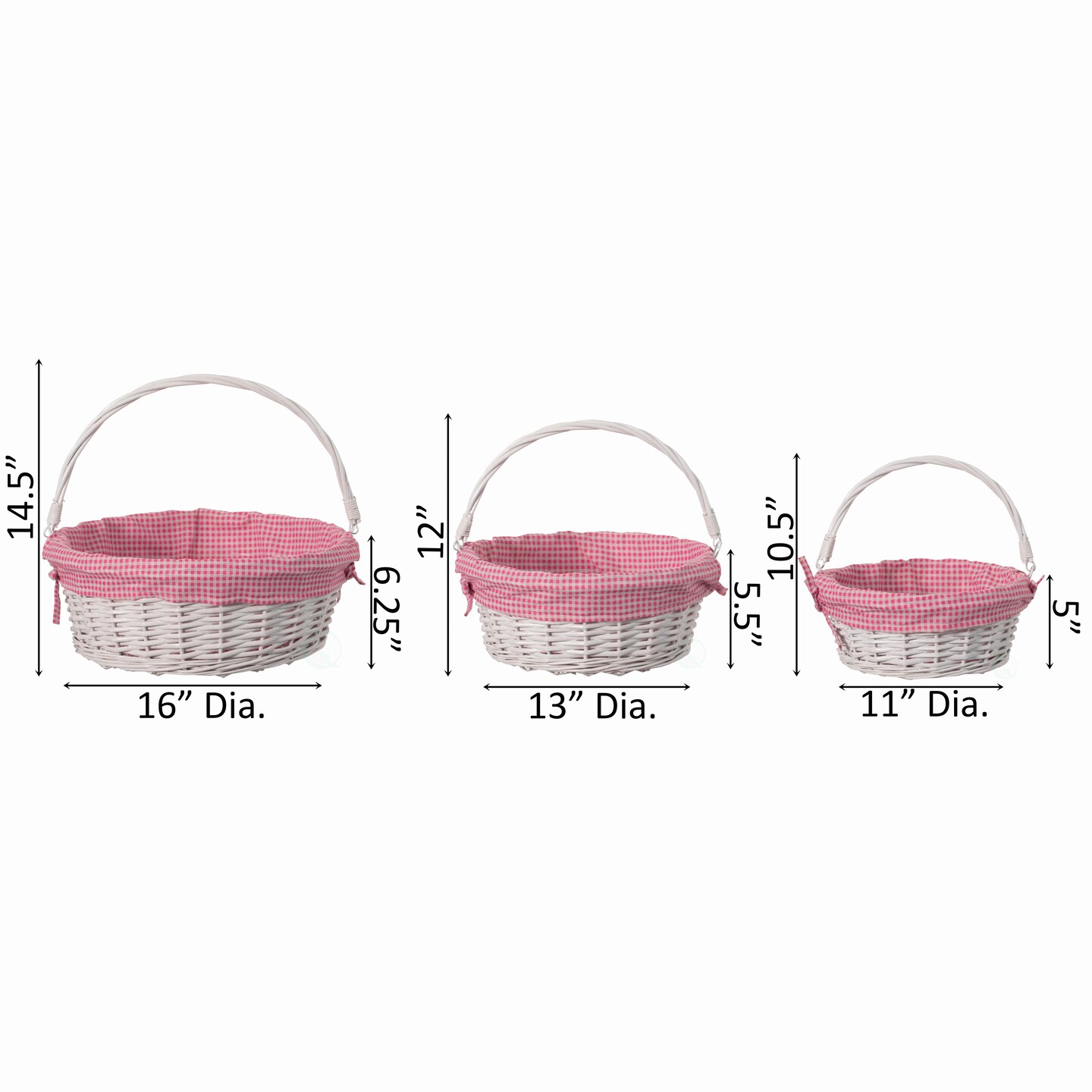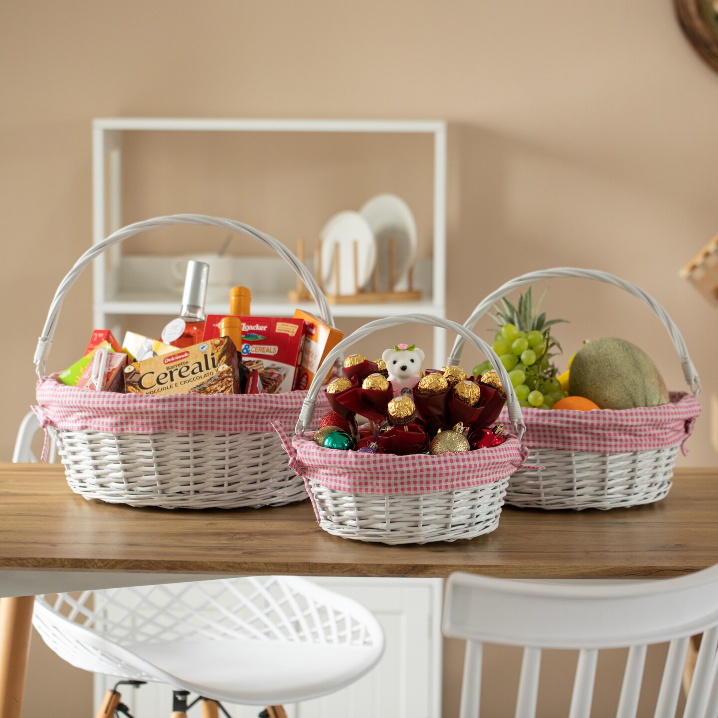 Traditional White Round Willow Gift Basket with Gingham Liner and Sturdy Foldable Handles, Food Snacks Storage Basket