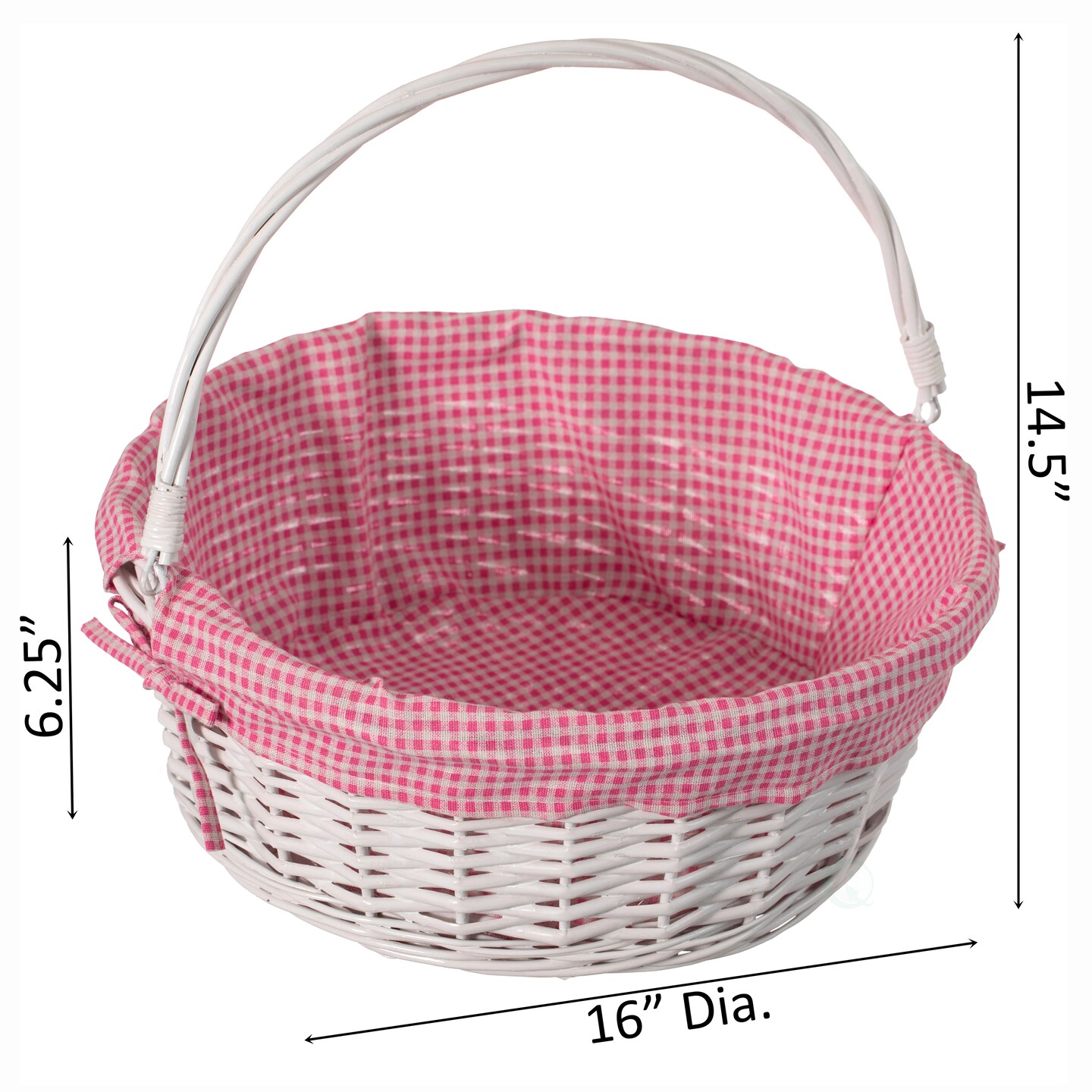 Traditional White Round Willow Gift Basket with Gingham Liner and Sturdy Foldable Handles, Food Snacks Storage Basket