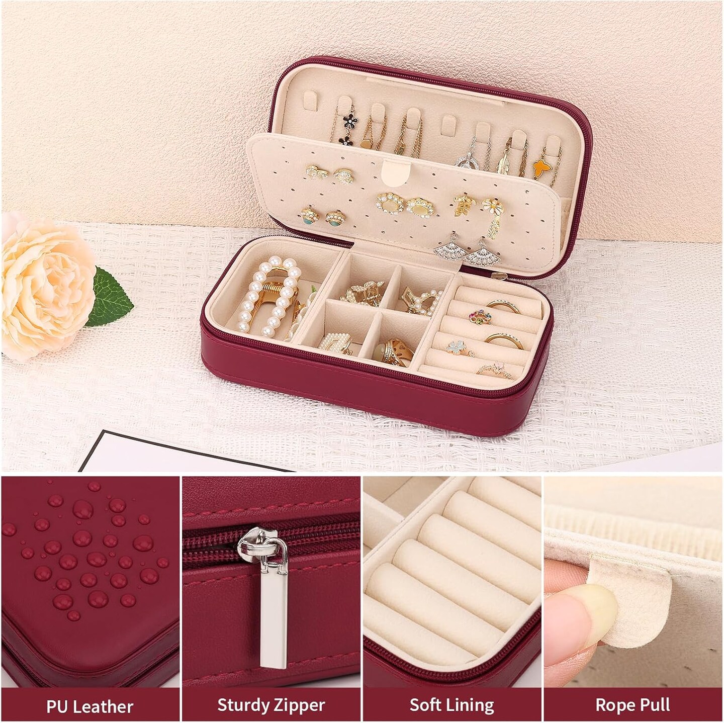 Travel Jewelry Storage, PU Leather Portable Jewelry Case, Small Jewelry Boxes for Gifts, Travel Jewelry Organizer for Women Rings Earrings Necklaces Bracelets (Wine Red)