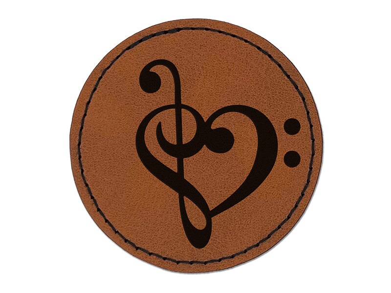 Treble Bass Clef Heart Music Love Round Iron-On Engraved Faux Leather Patch Applique - 2.5"