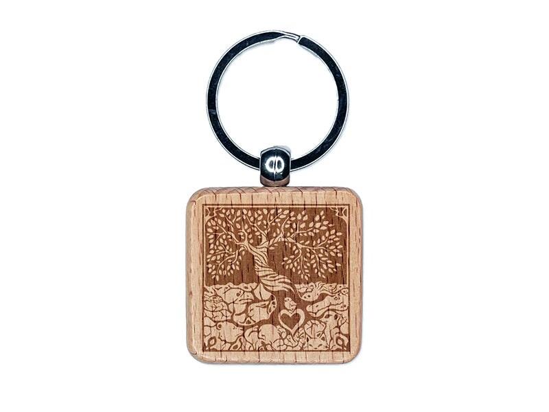 Tree of Life with Hidden Animals in Roots Engraved Wood Square Keychain Tag Charm
