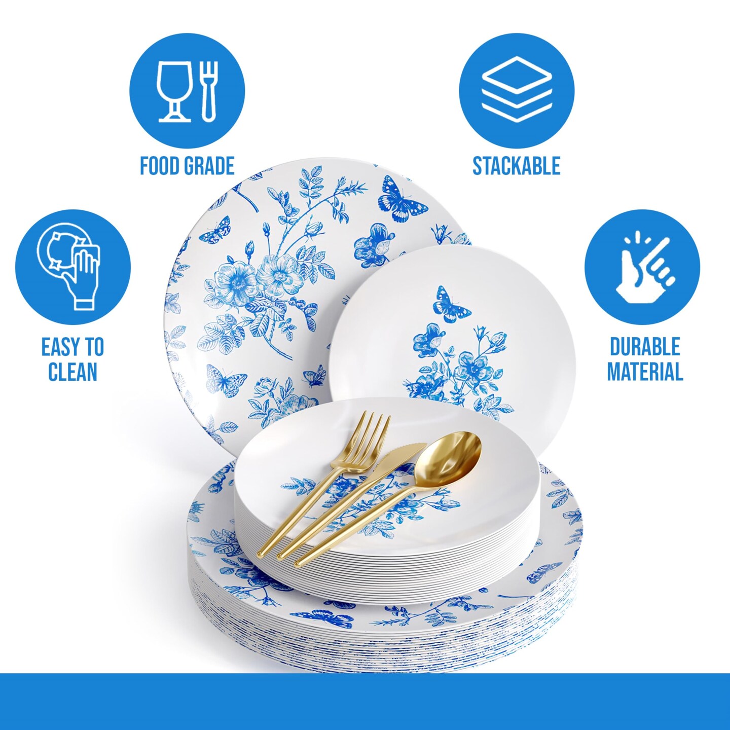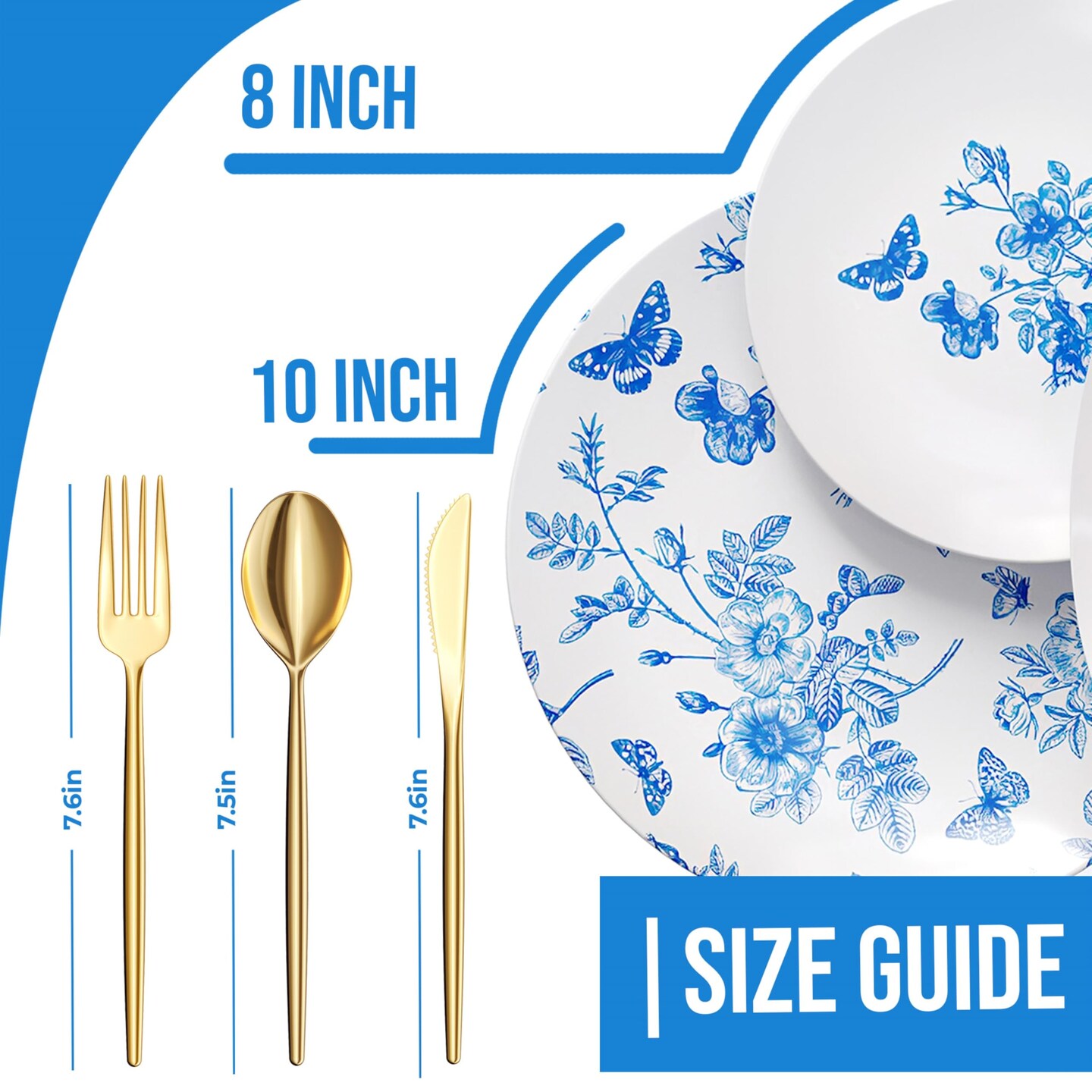 Trendables Fancy Plastic Dinnerware Sets Gold Silverware Disposable 20 X 10 Inch Charger Plates 20 X 8 Inch Dessert Plates 20 x Gold Plastic Forks and Spoons Knives