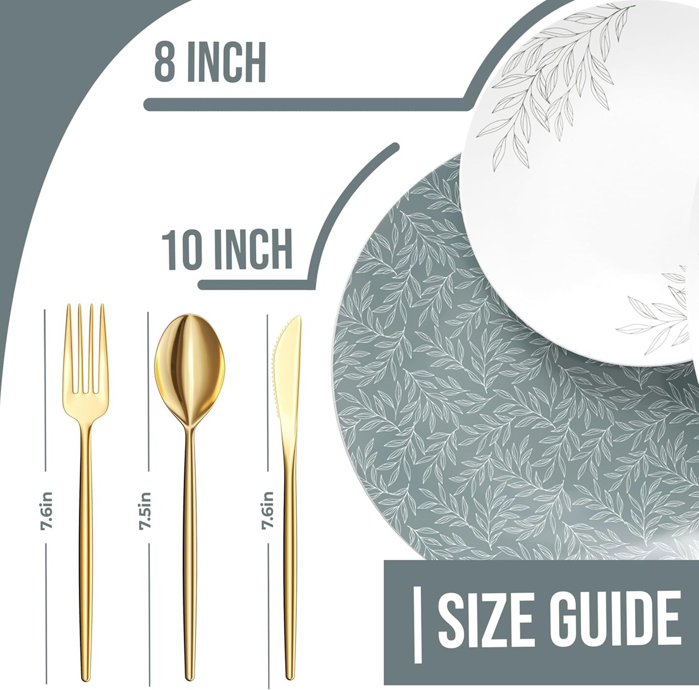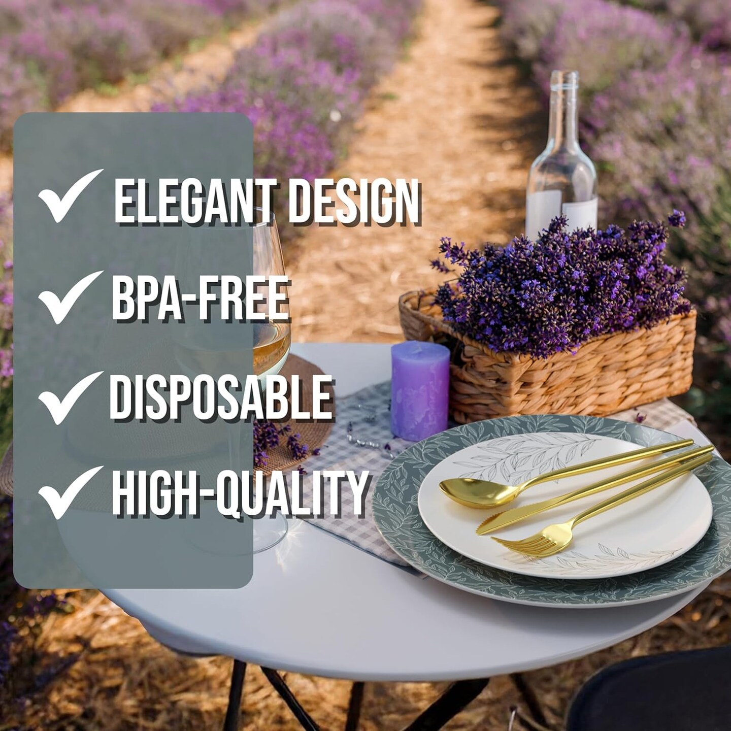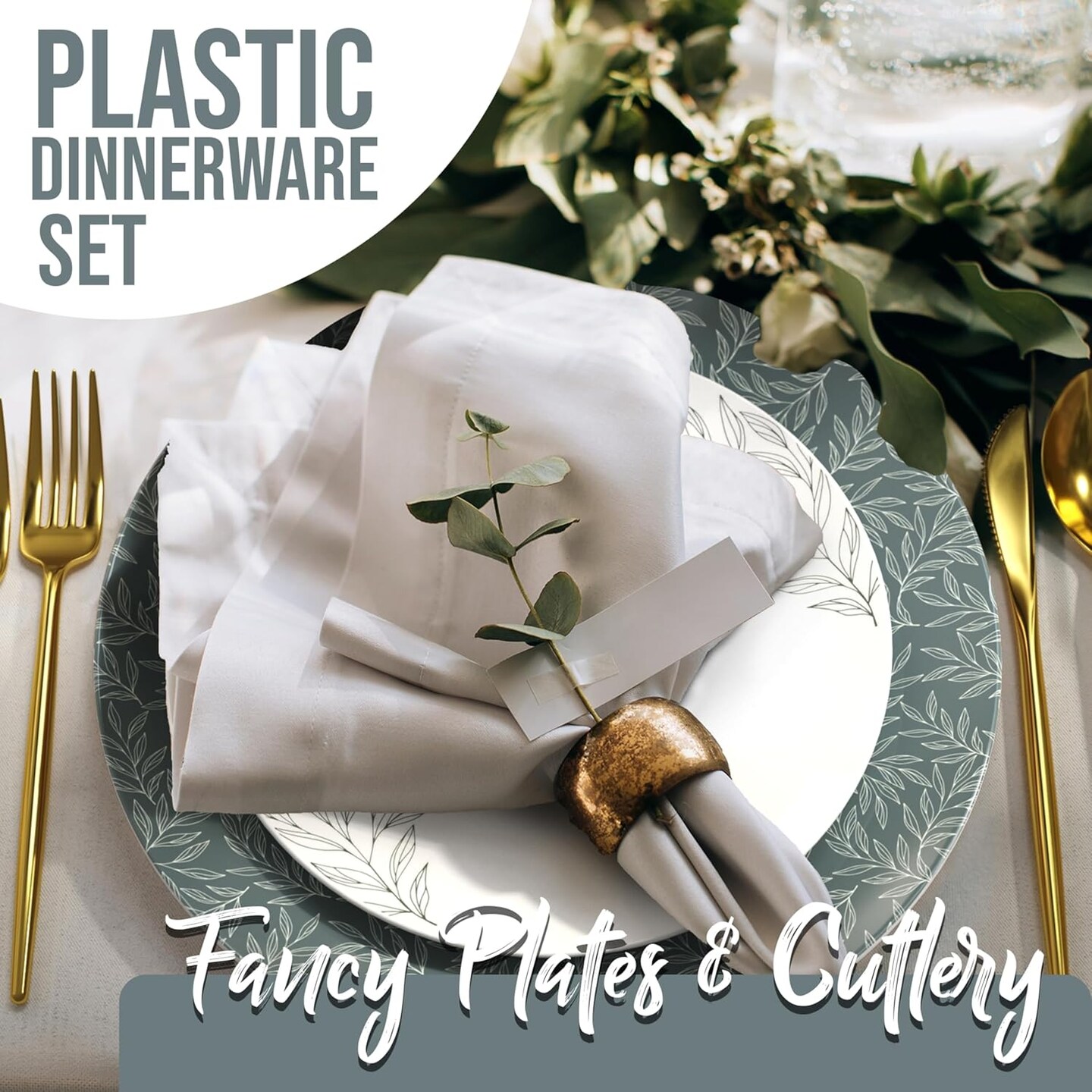 Trendables Fancy Plastic Wedding Dinnerware Set – Gold Disposable Forks Spoons Knives, 10” Charger Plates & 8” Dessert Plates – Elegant Reception, Holiday, Banquet & Special Event Supplies