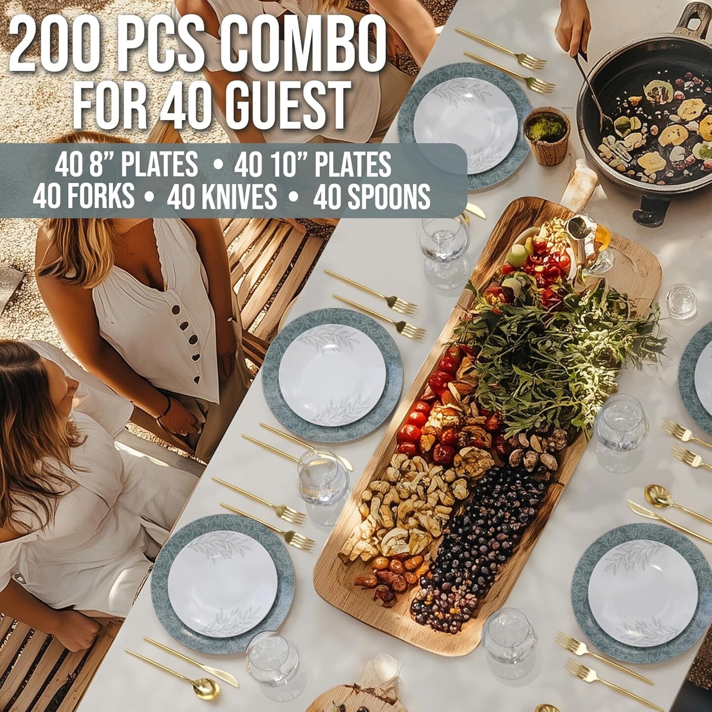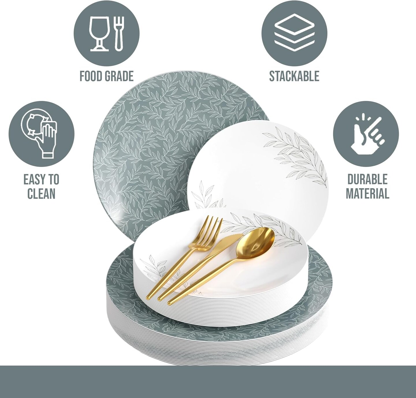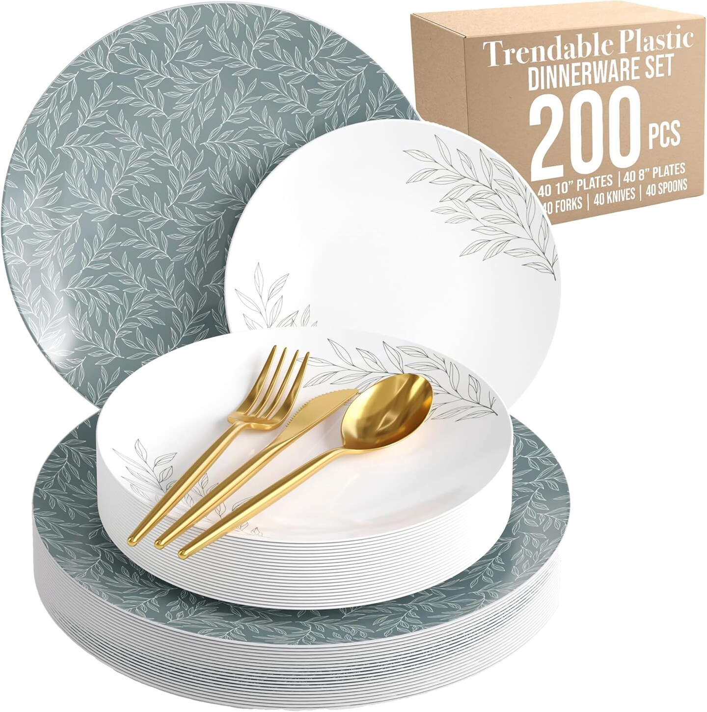 Trendables Fancy Plastic Wedding Dinnerware Set – Gold Disposable Forks Spoons Knives, 10” Charger Plates & 8” Dessert Plates – Elegant Reception, Holiday, Banquet & Special Event Supplies