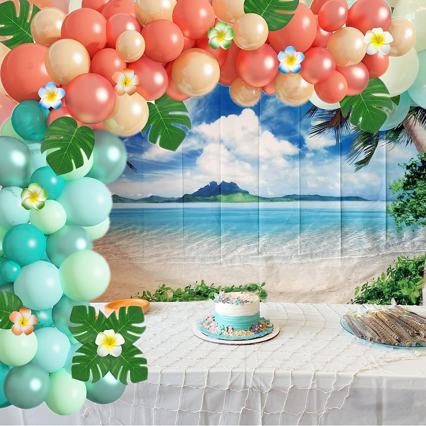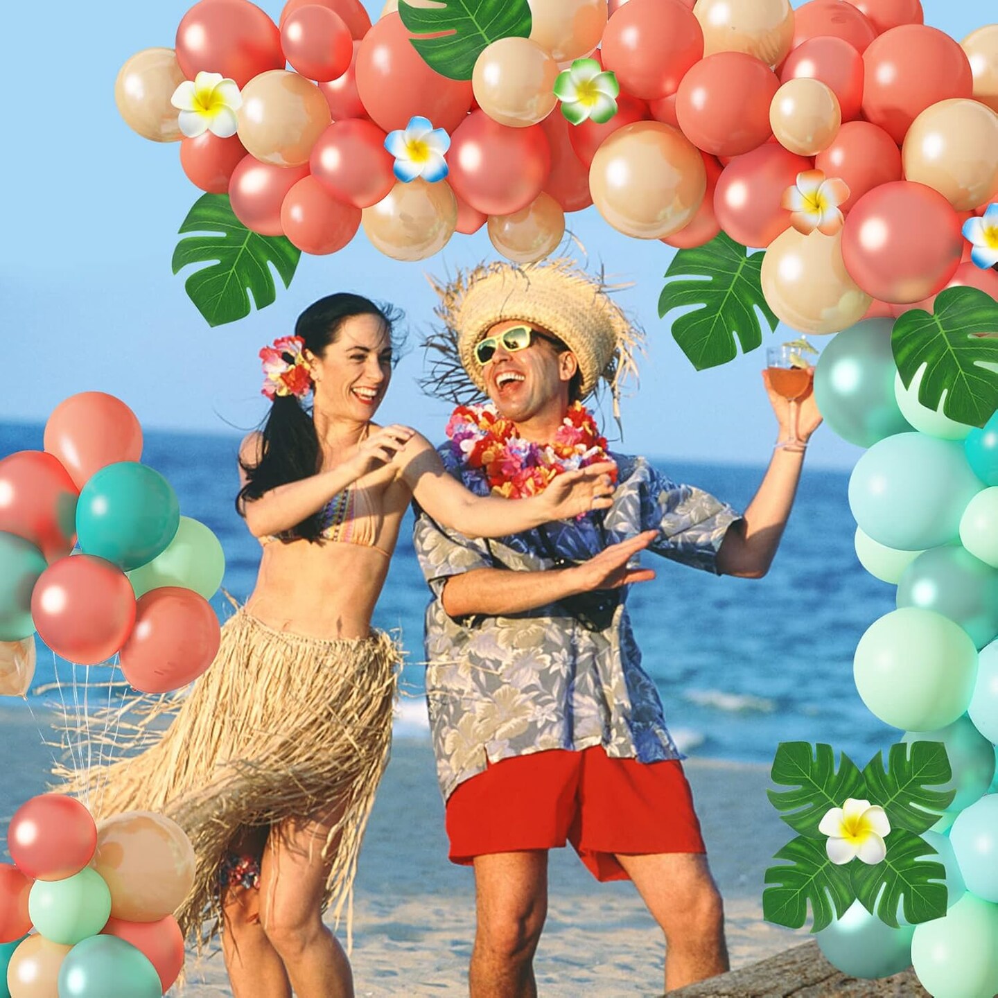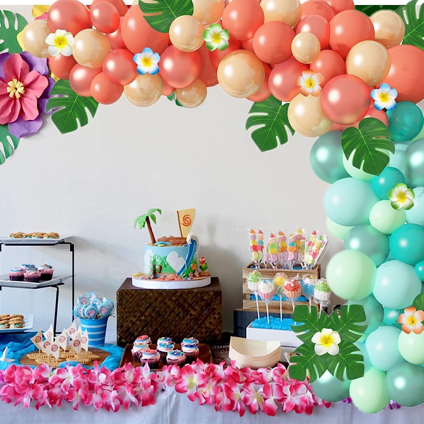 Tropical Balloon Garland Arch Kit, 12"10"5" Rose Gold Blush Blue Balloons Artificial Palm Leaves Plumeria for Magic Theme Birthday Party Supplies Baby Shower Hawaii Luau Party Decorations