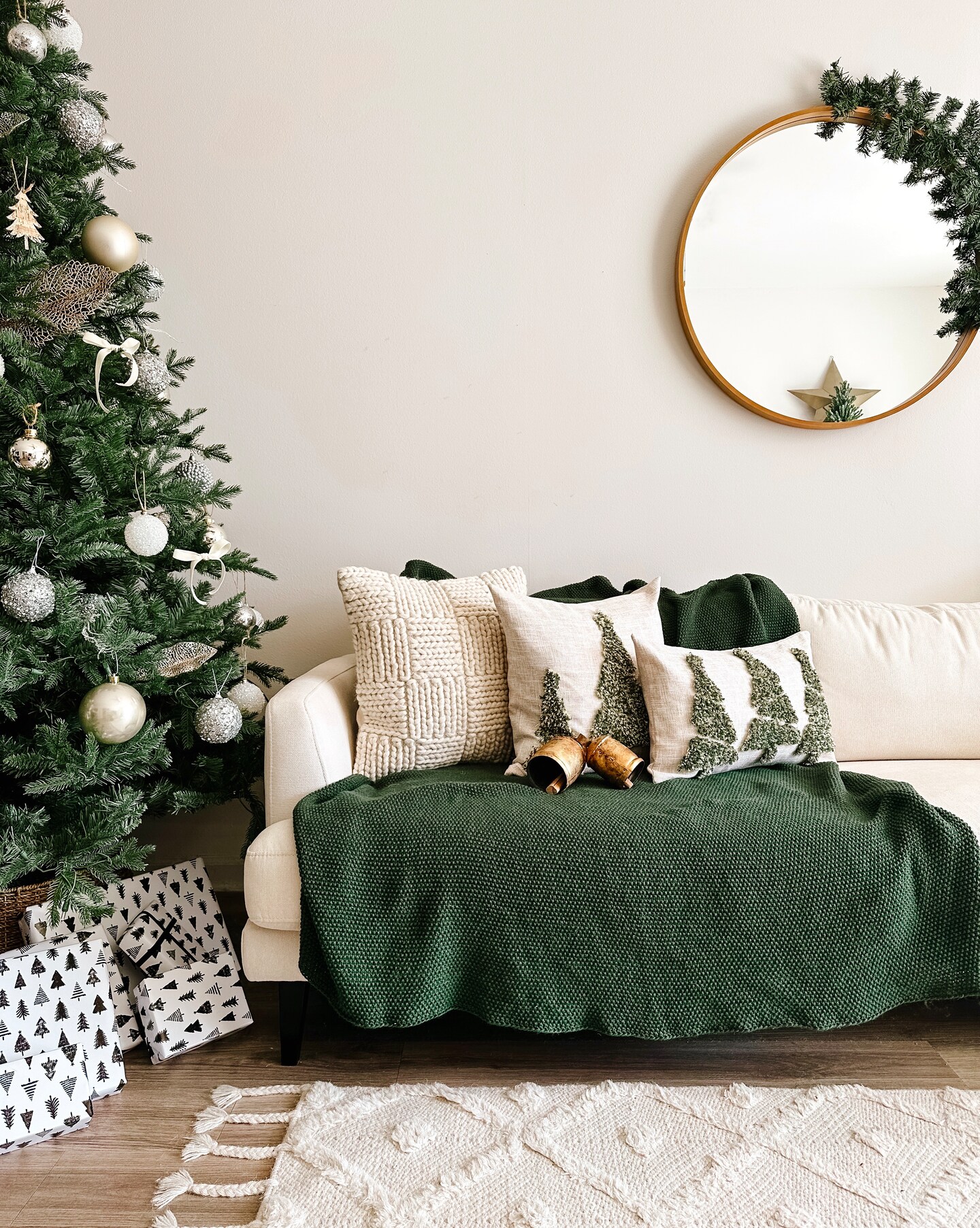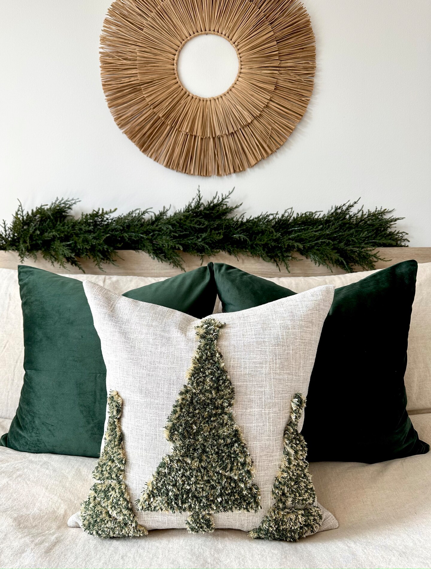 Tufted Noel Christmas Tree Pillow Cover – Beige Linen with Green & Gold Trees, 18"