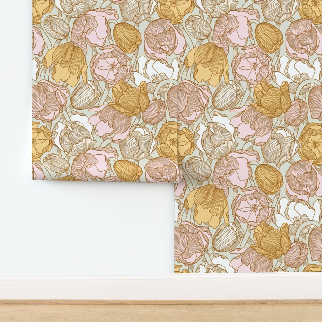 Tulip Floral Modern Botanical Garden Bloom Meadow Wildflower Pink Yellow Mint Spring Pastel Custom Pre-pasted Wallpaper by Spoonflower Pre-Pasted Wallpaper 2FT Wide