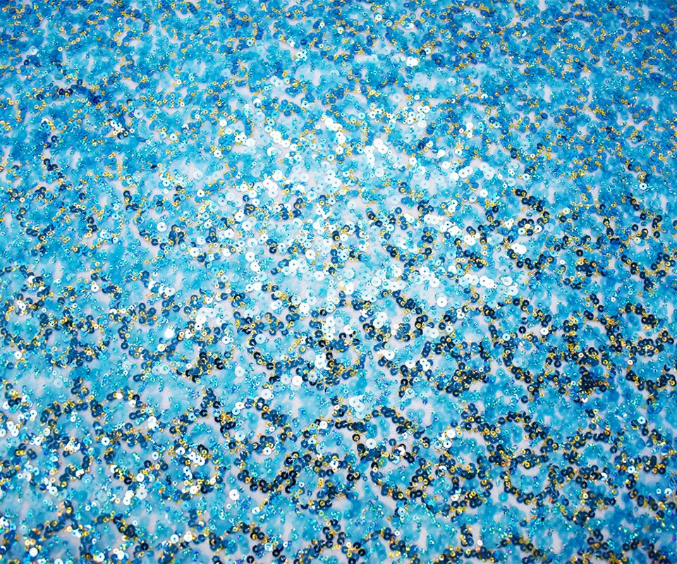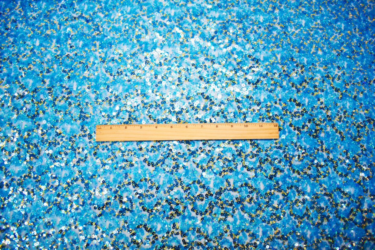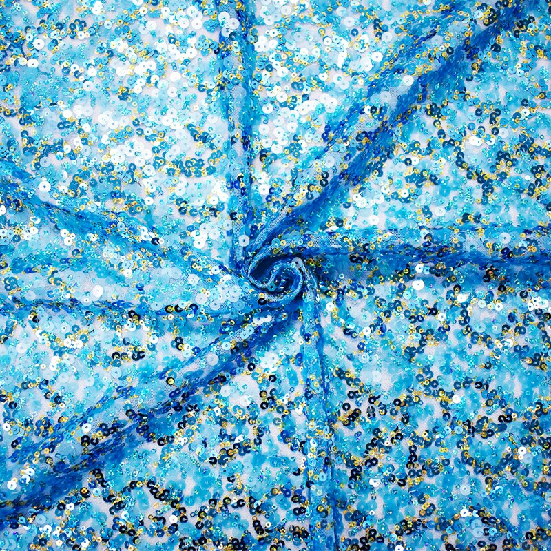 Turquoise-Gold Polyester Sequined Tulle Mesh Fabric By the Yard