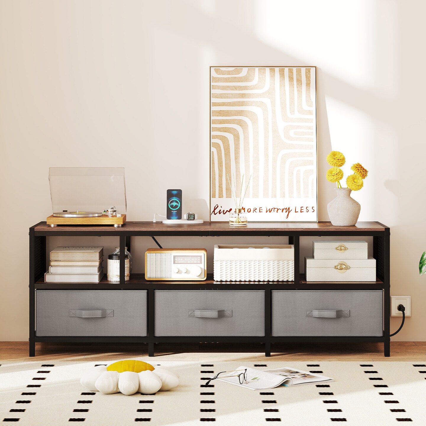 TV Stand with Charging Station, Metal Frame and Storage Drawers