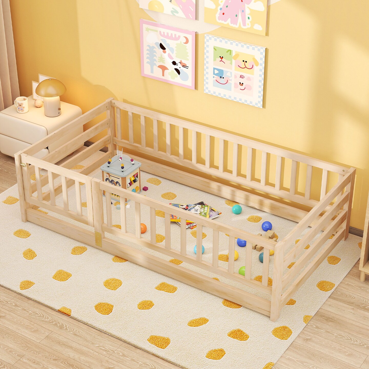Twin Size Pine Wood Montessori Floor Bed with Safety Guardrails and Lockable Door
