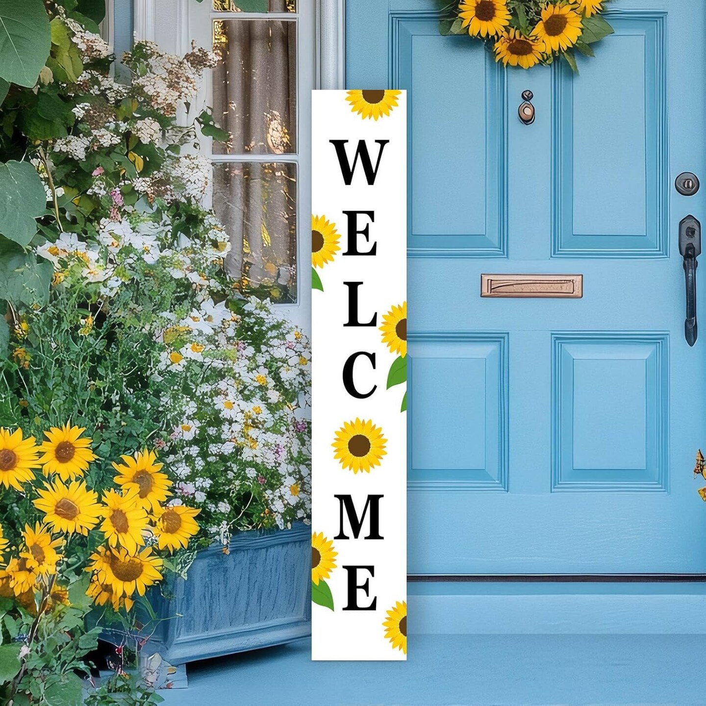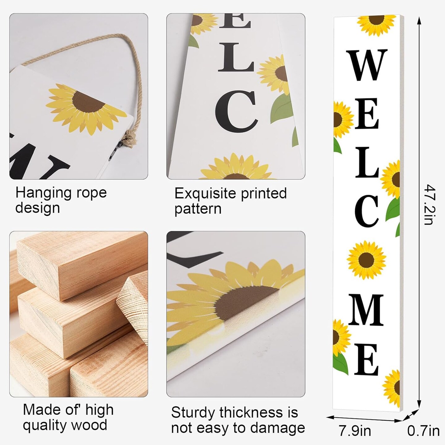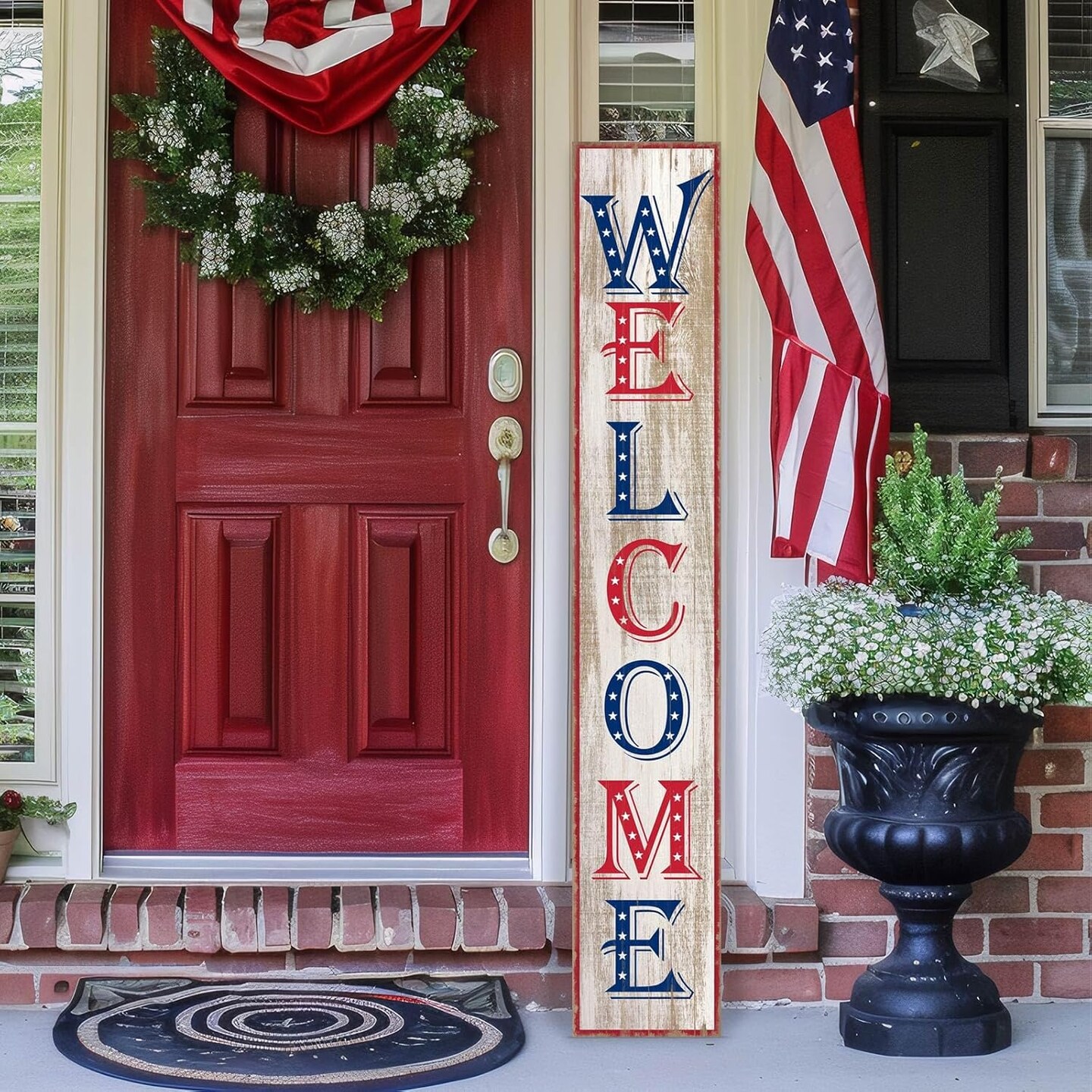 Two Sided Summer 4th of July Porch Sign, Wooden Sunflower Patriotic Independence Day Welcome Sign for Front Door Decor, Tall Vertical Leaner Standing Americana Outdoor Decorations