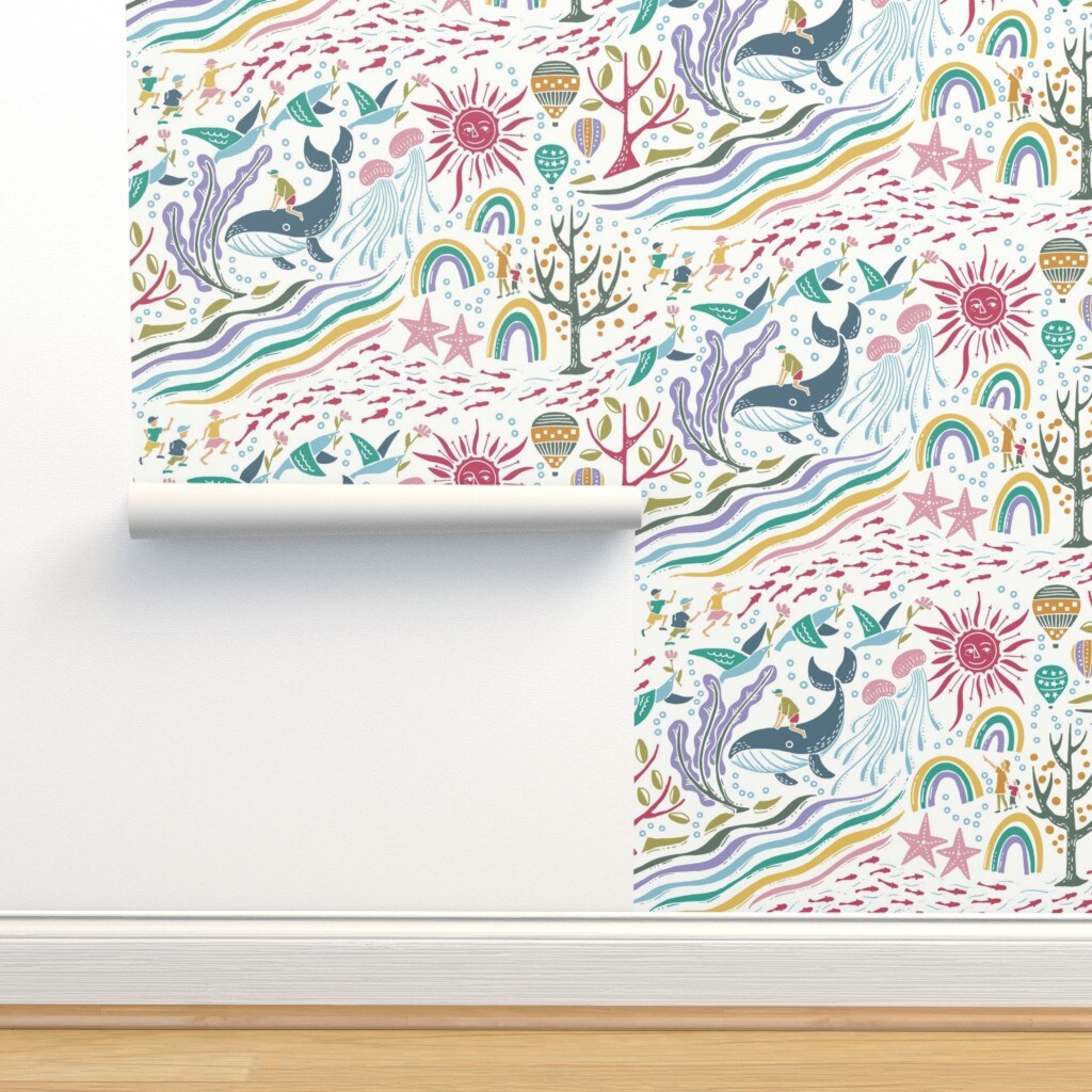 Under The Sea Blue Pink Purple Whale Sun Sea Creatures Custom Removable Wallpaper by Spoonflower Peel & Stick Wallpaper 2FT Wide