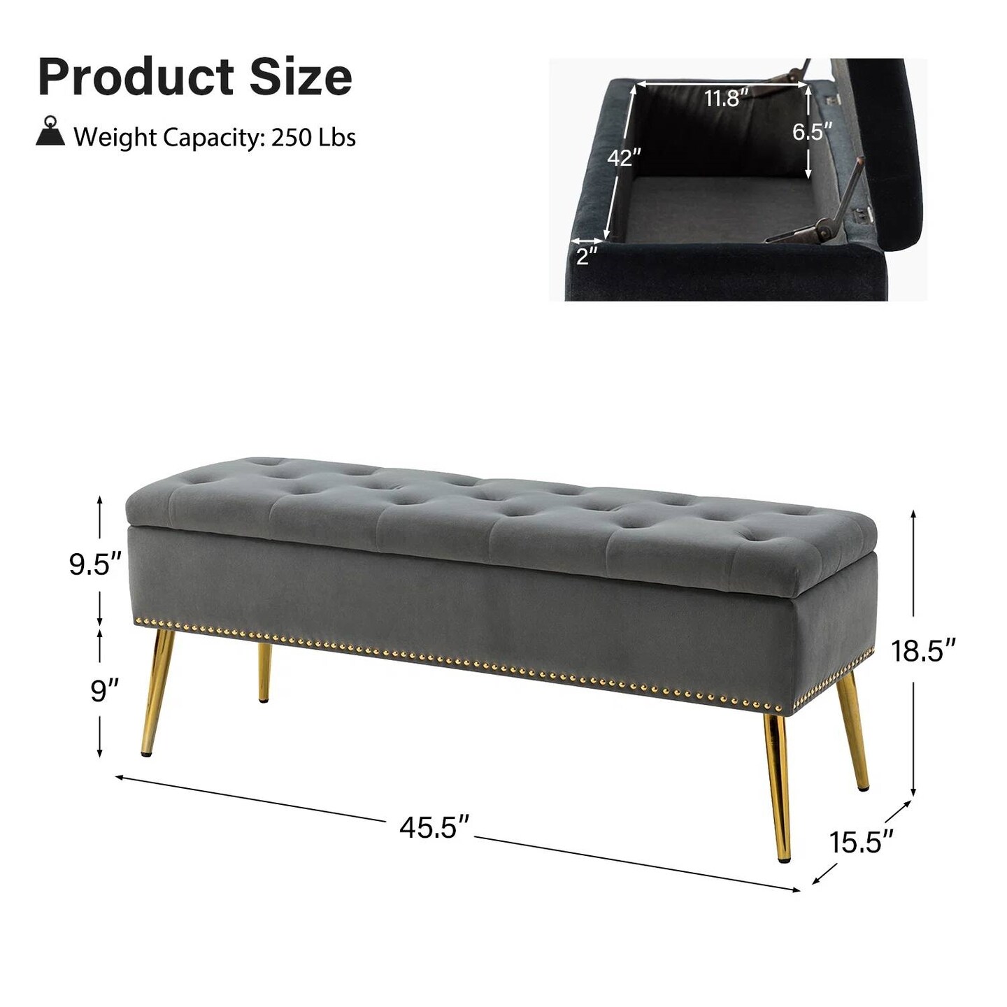 Upholstered Velvet Storage Bench with Tufted Seat and Gold Metal Legs