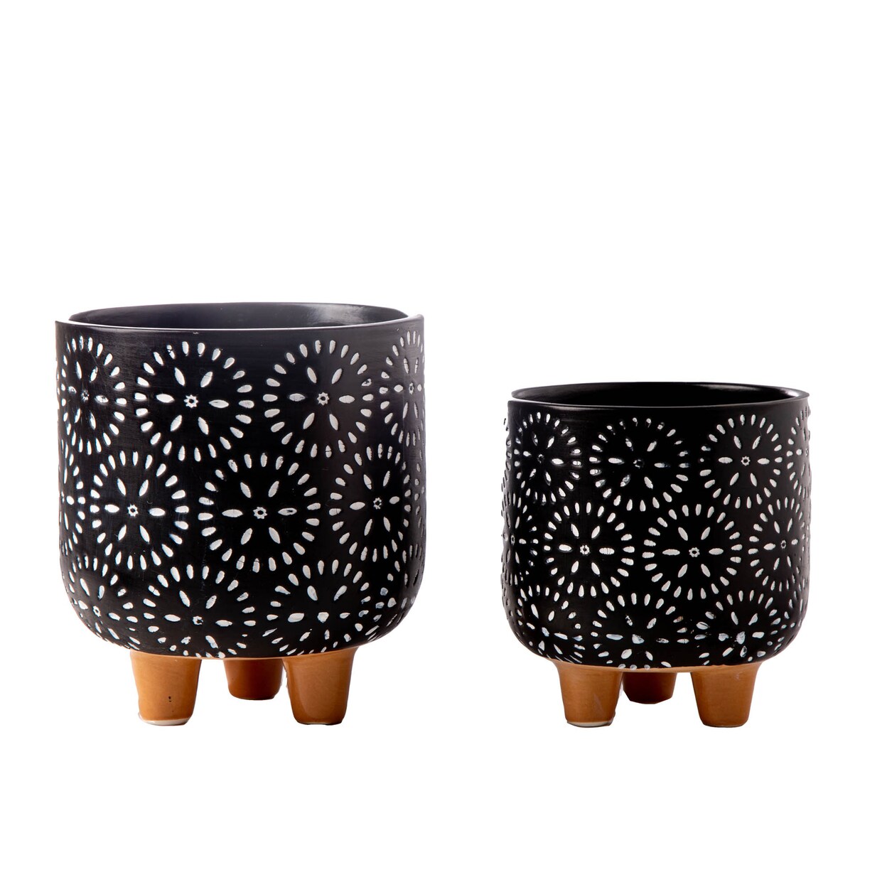 Urban Trends Collection Ceramic Round Pot with Bursting Pattern Design Body on Tripod Stand Set of Two Matte Finish - Black