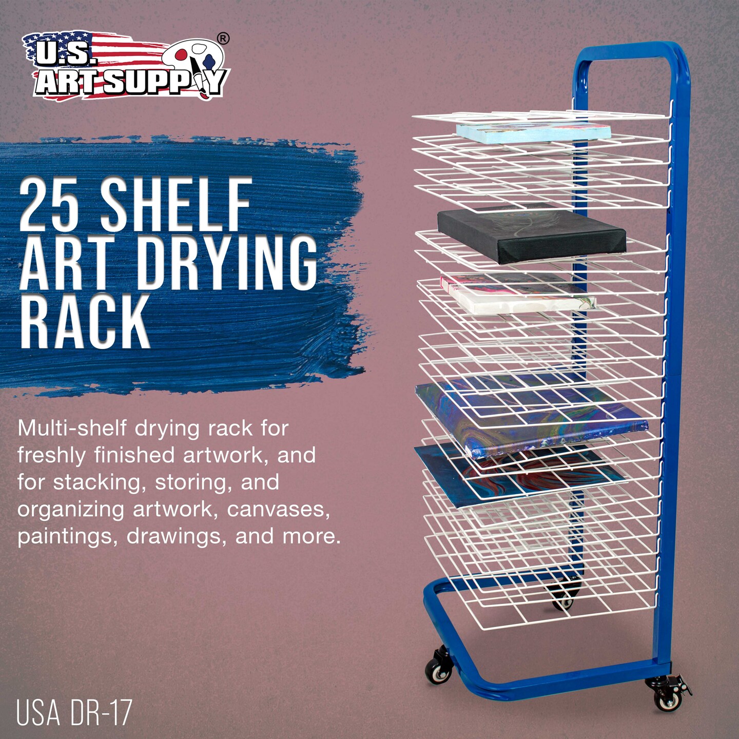 U.S. Art Supply 25 Shelf Art Drying Rack for Classrooms and Studios - Mobile Wheels, Wall Mountable, 25 Removable Shelves - Stack Store Artwork