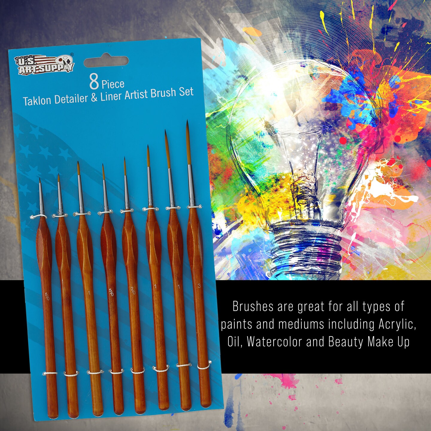 U.S. Art Supply 8 Piece Taklon Detail and Liner Artist Brush Set with Wood Comfort Grip Handles - Art, Detailing, Acrylic, Oil, Watercolor