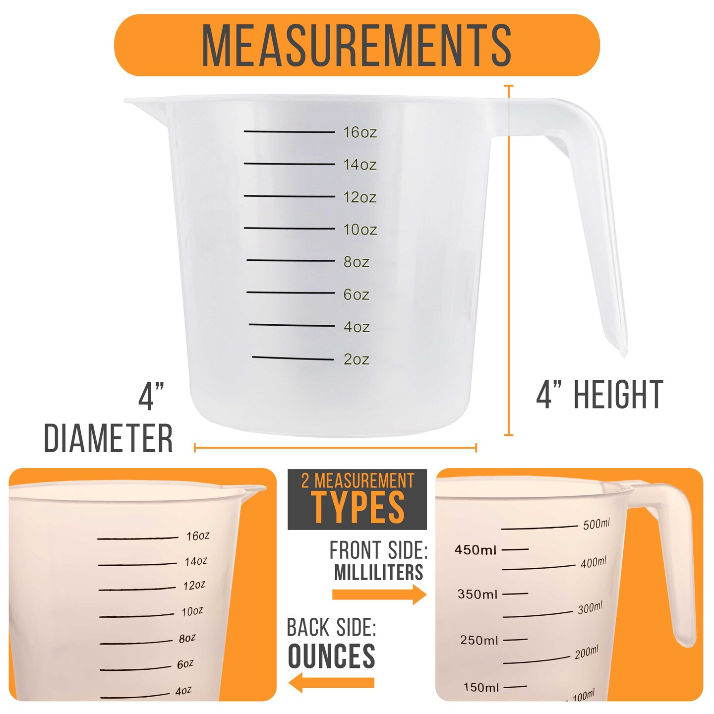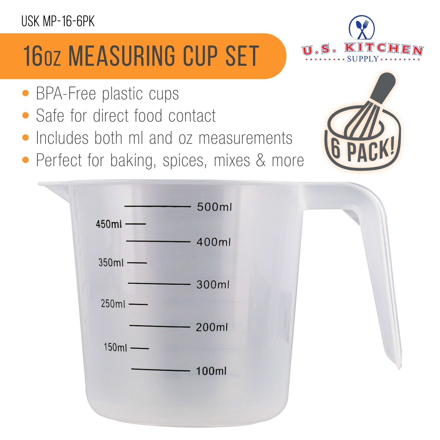 U.S. Kitchen Supply 6 Pack Plastic Measuring Cups with Handles - 16 oz Liquid Measuring Cup, Clear Microwave Safe Kitchen Cups - Measure in mL or Ounces, Measurement Cup for Cooking