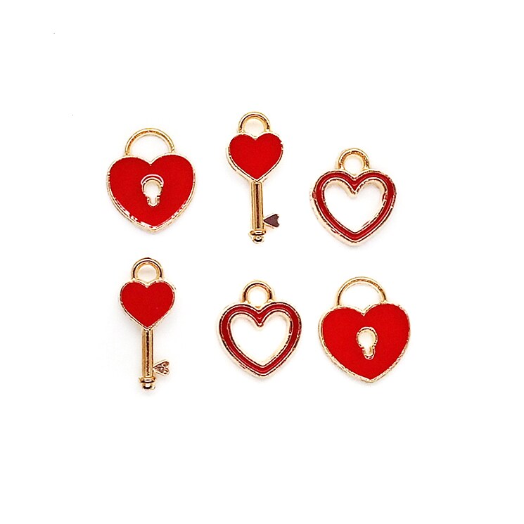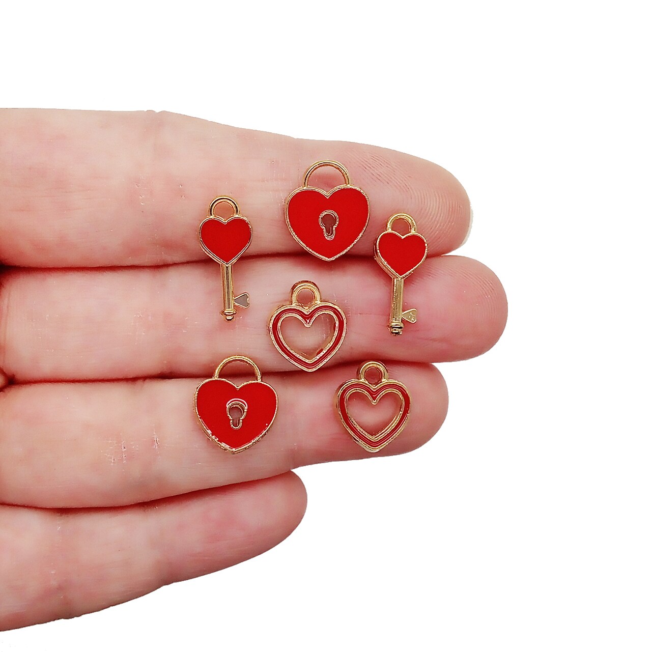 Valentine's Day Charms, Tiny Enamel Heart Locks and Keys, 6 pcs, Adorabilities