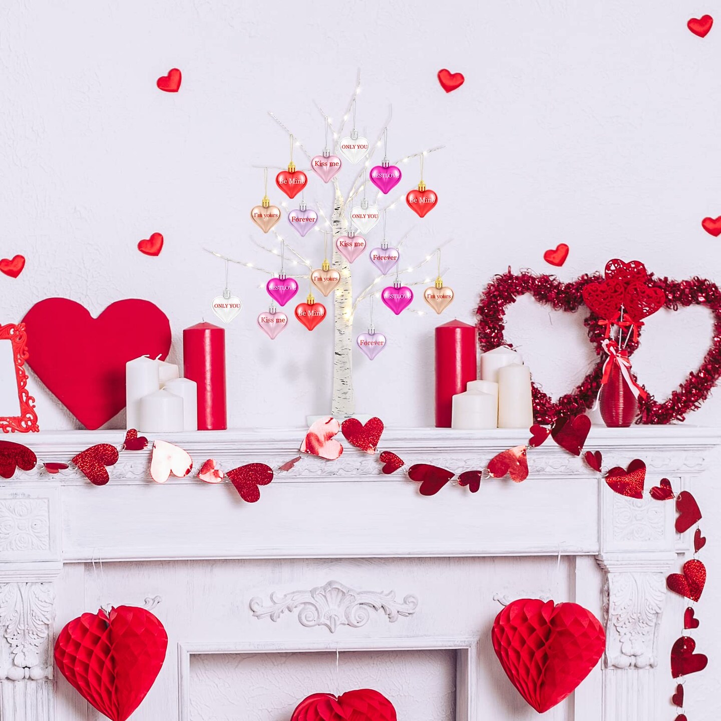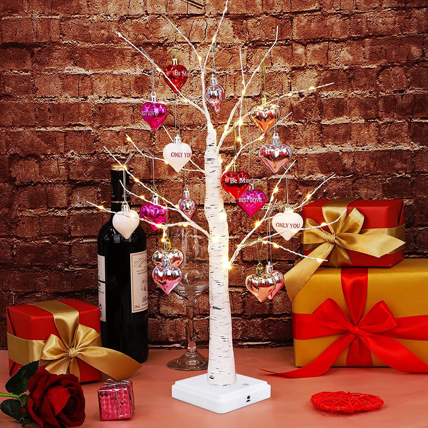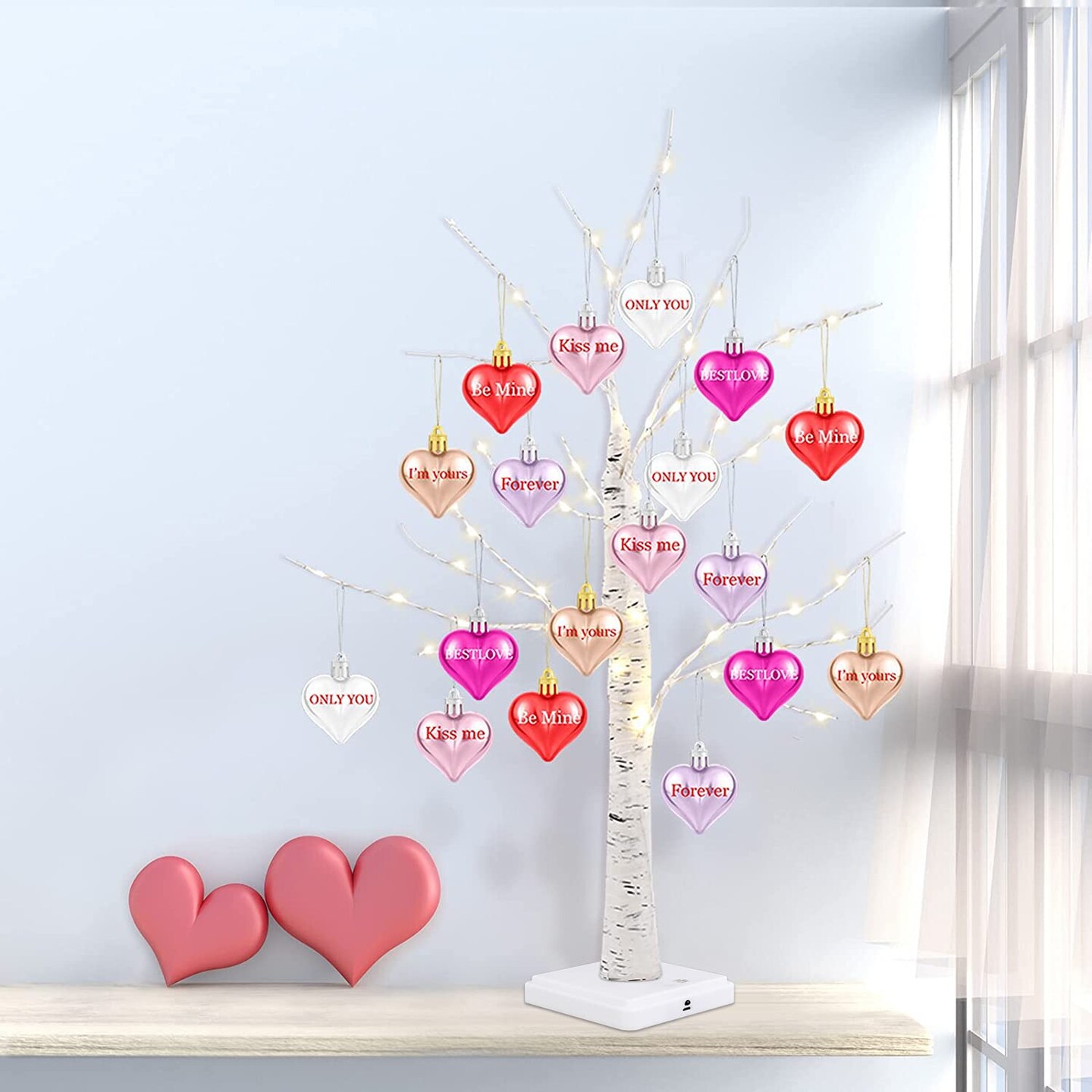 Valentine's Day Tree Decoration with LED Lights 21.7 Inch Tabletop Birch Tree with Timer Battery USB Powered with Valentine's Day Heart Ornaments for Home Valentine Wedding Decor