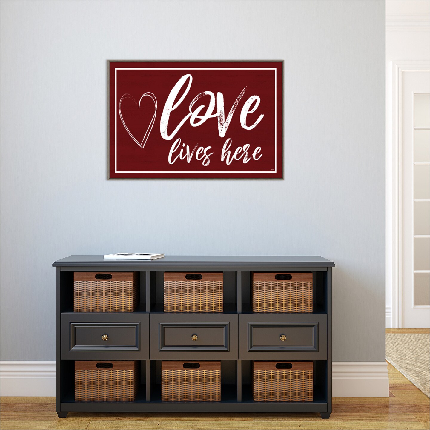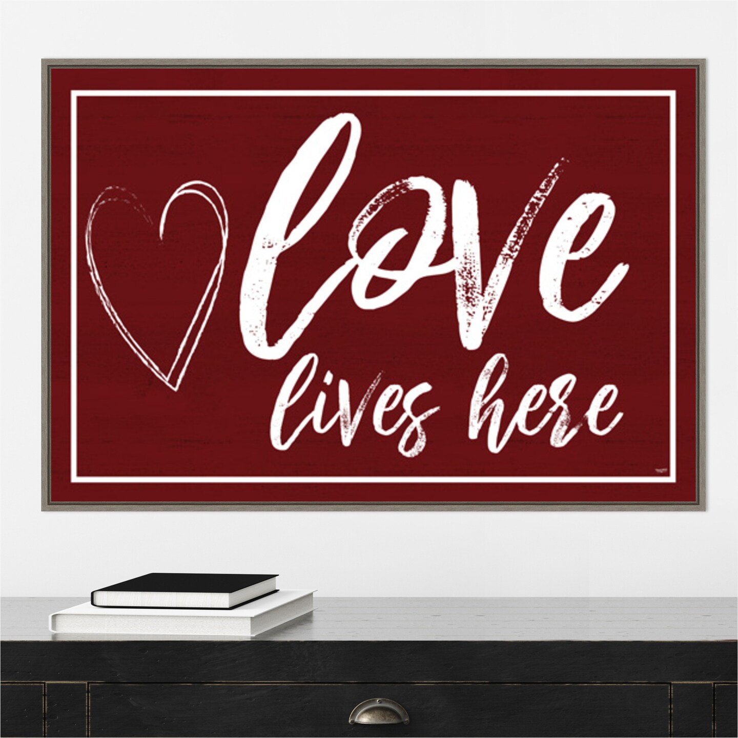 Valentines Sentiment V Love Lives Here by Tara Reed 33-in. W x 23-in. H. Canvas Wall Art Print Framed in Grey