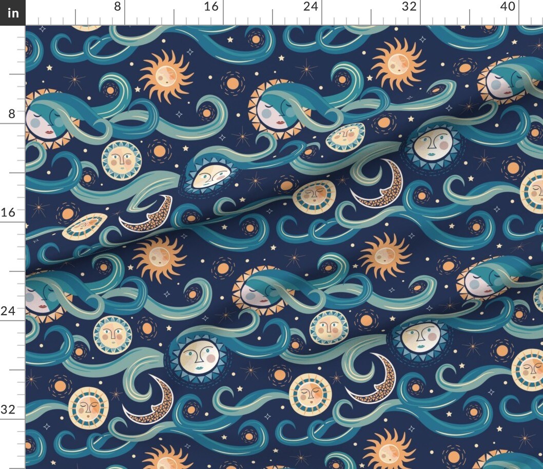 Various Fabrics by the Yard or Fat Quarter Abstract Whimsical Celestial Sun Moon Mystical Stars Clouds Night Sky Blue Yellow Eclectic 90S Modern Folk Art Novelty Bohemian Custom Printed Fabric by Spoonflower