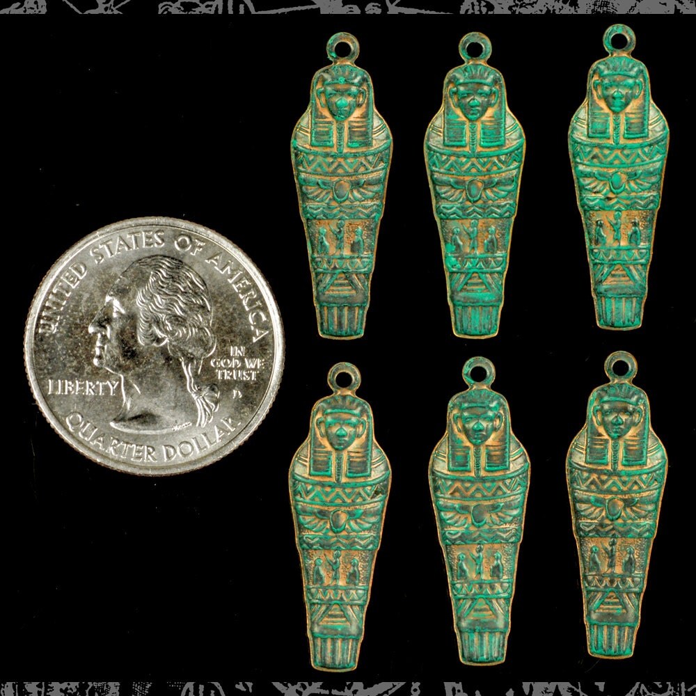 Verdigris Finished Brass Egyptian Mummy Sarcophagus Charms or Pendants - Set of Six - V-C73