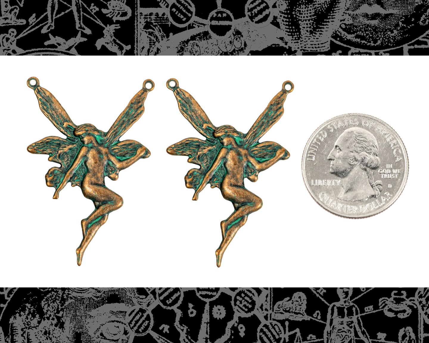 Verdigris Finished Brass Fairy Pendants with Two Rings - Set of Two - V-P26