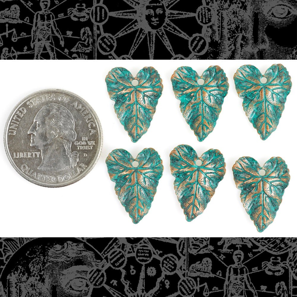 Verdigris Finished Brass Heart Shaped Leaf Charms - Set of Six - V-C49