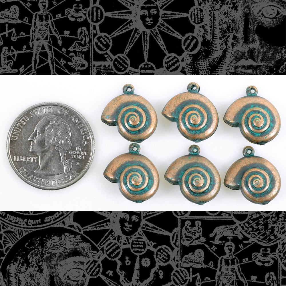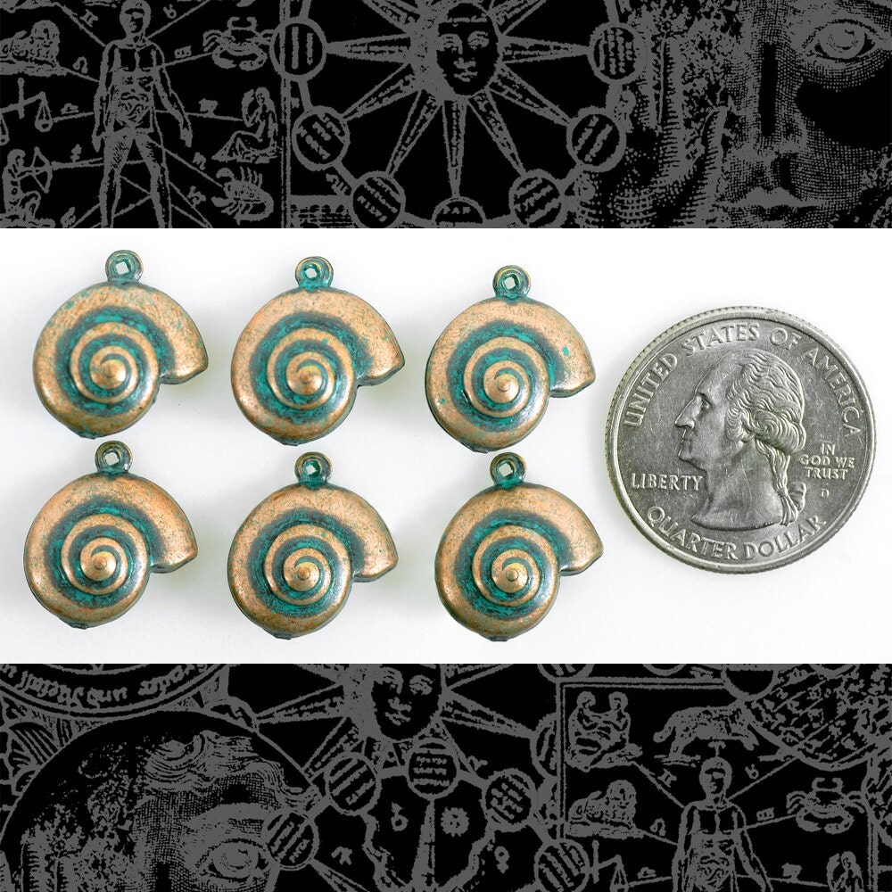 Verdigris Finished Brass Sea Snail Two Sided Charms - Set of Six - XXX - V-C133