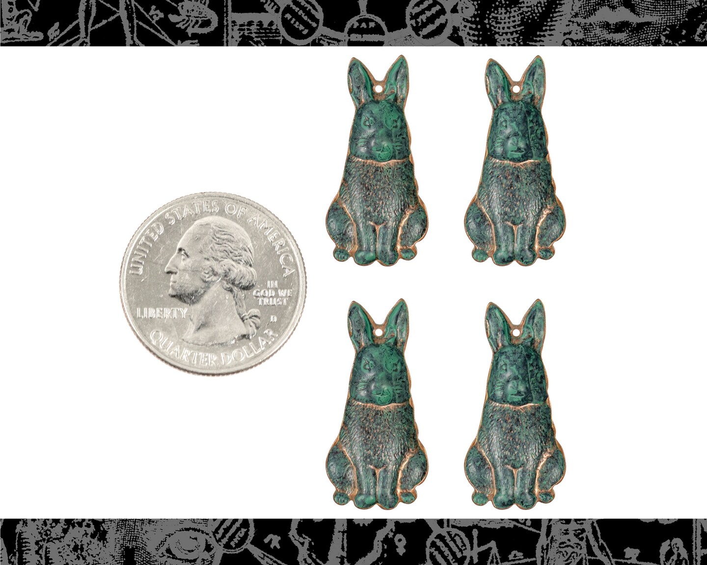 Verdigris Finished Brass Sitting Wild Rabbit Charms - Set of Four - V-C226