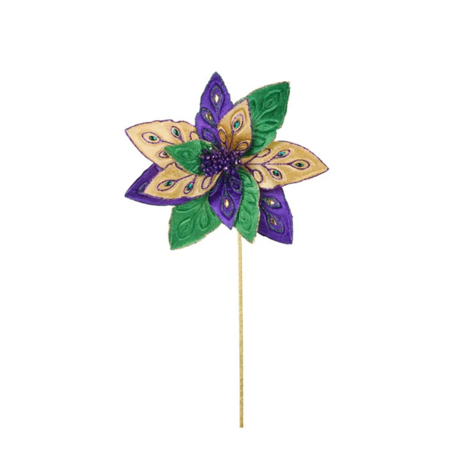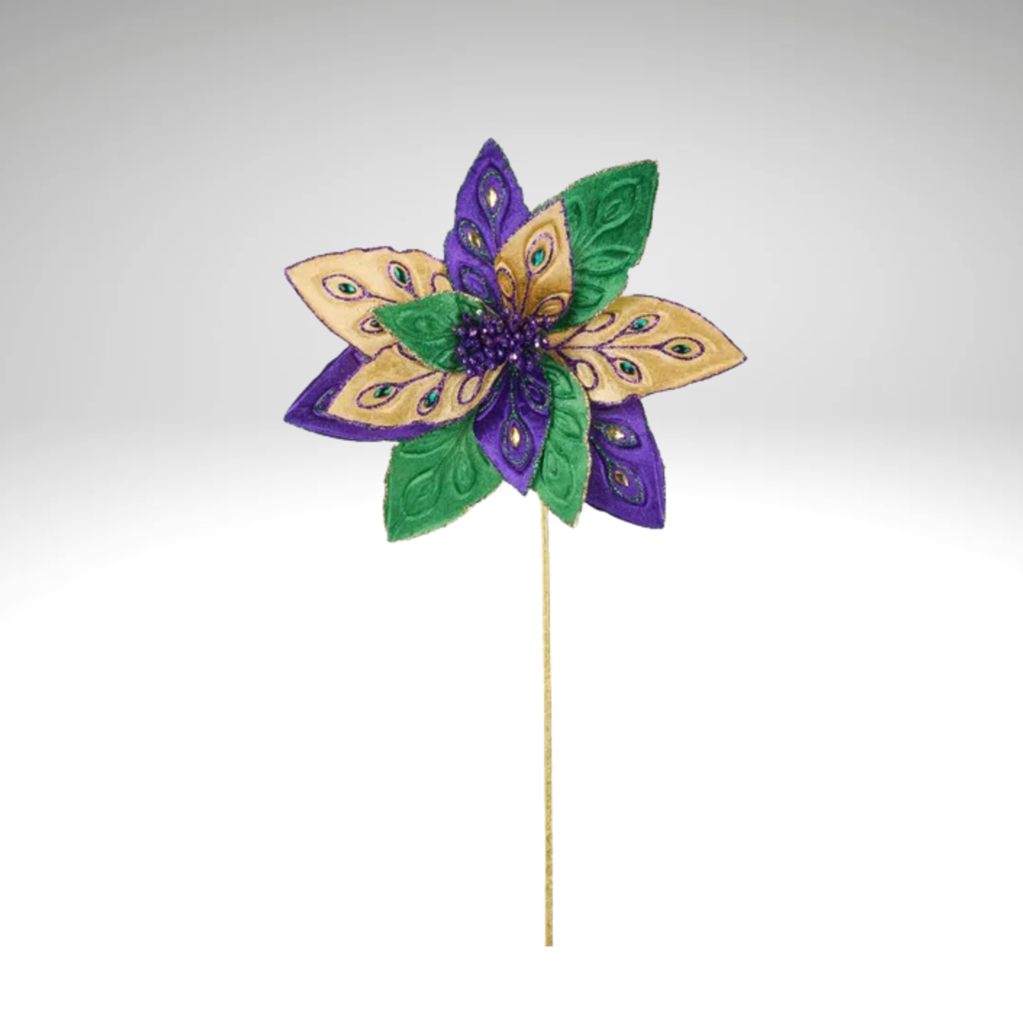 Vibrant Mardi Gras Poinsettia Flower Stem in Green, Purple & Gold - 22"L Decorative Supply-HG3266