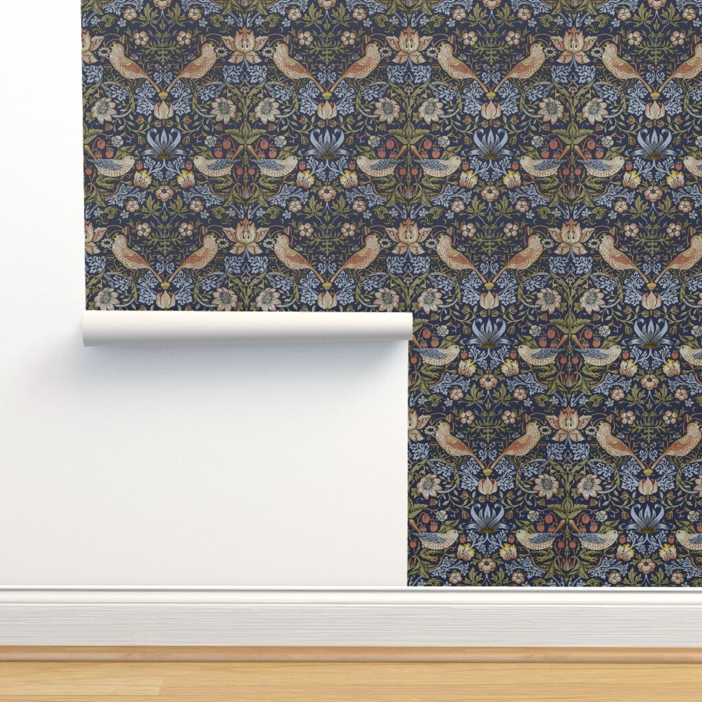 Victorian Floral Morris Inspired Arts And Crafts Damask Birds Art Nouveau Blue Green Custom Removable Wallpaper by Spoonflower Peel & Stick Wallpaper 2FT Wide