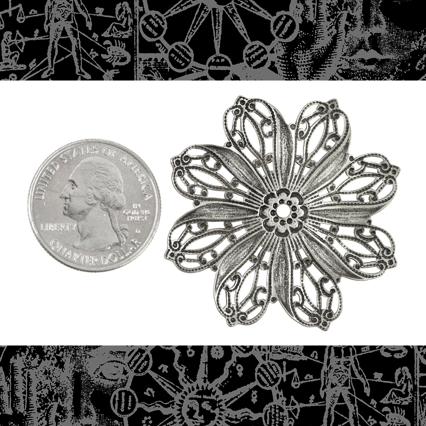 Vintage Filigree Wrap - Antiqued Silver Plated Brass Round 42mm Flower Wrap - One S-W45