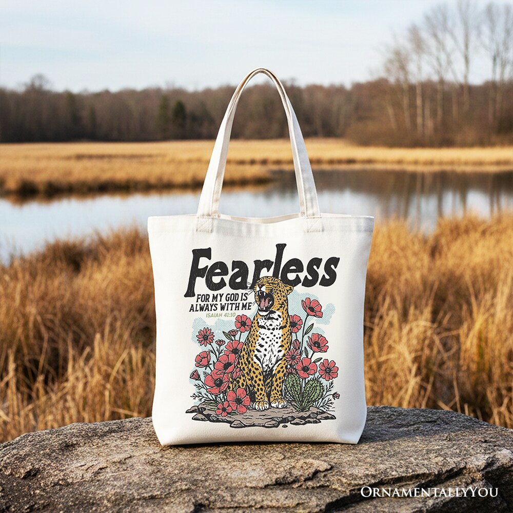 Vintage Floral Leopard Christian Canvas Tote Bag, Fearless For My God Is Always With Me Isaiah 41:10 Gift Shopper