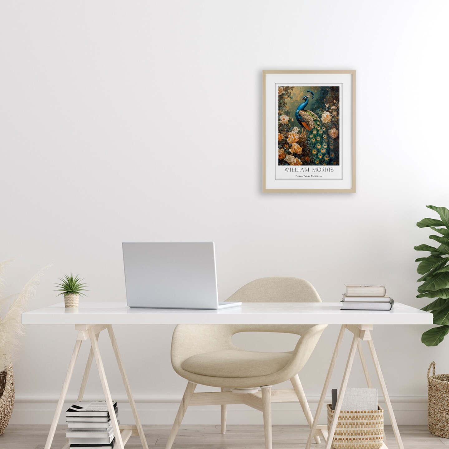 Vintage Morris Inspired Blue Peacock Framed Print Under Glass Art