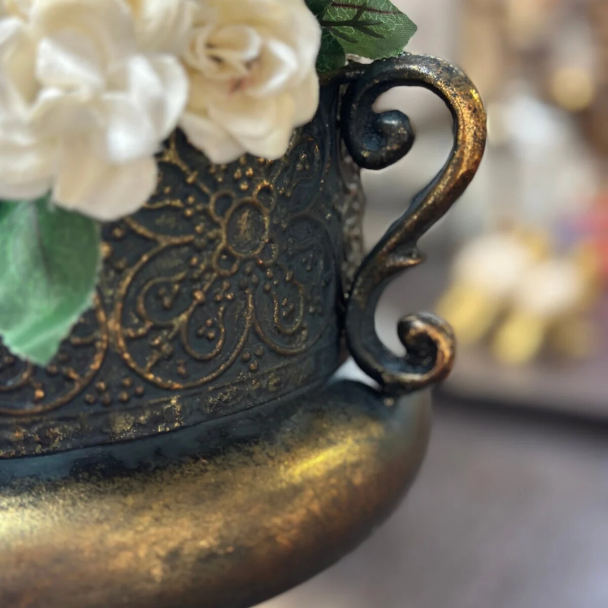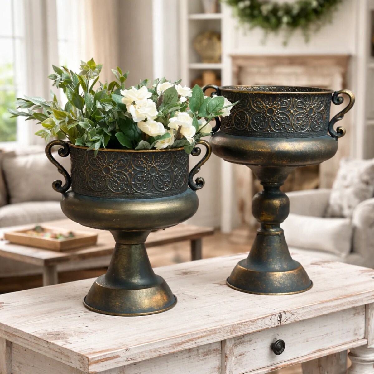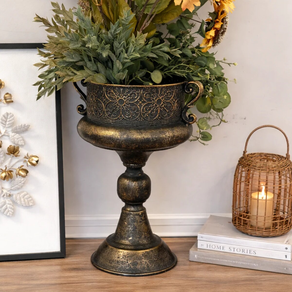 Vintage Ornate Metal Urn Vase Bronze Finish Pedestal Centerpiece