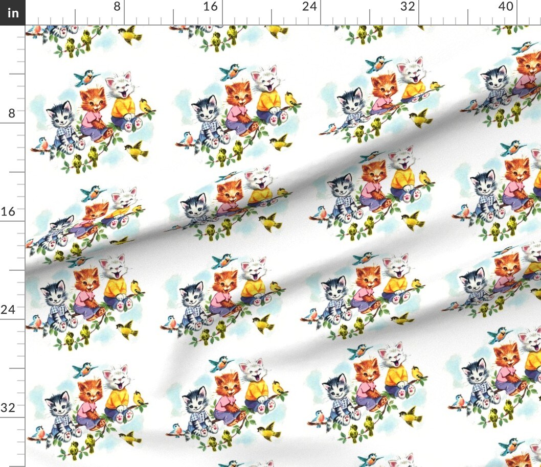 Vintage Retro Cats Kittens Birds Sky Clouds Children Nursery Trees Leaves Kids Fairy Custom Printed Fabric by Spoonflower Various Fabrics by the Yard or Fat Quarter