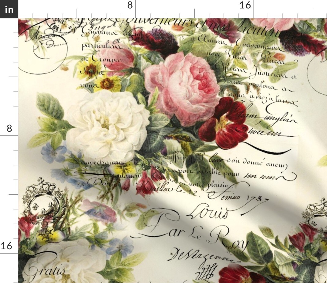 Vintage Roses Shabby Chic Victorian Romantic French Rose Garden Handwriting Typography Custom Printed Fabric by Spoonflower Various Fabrics by the Yard or Fat Quarter