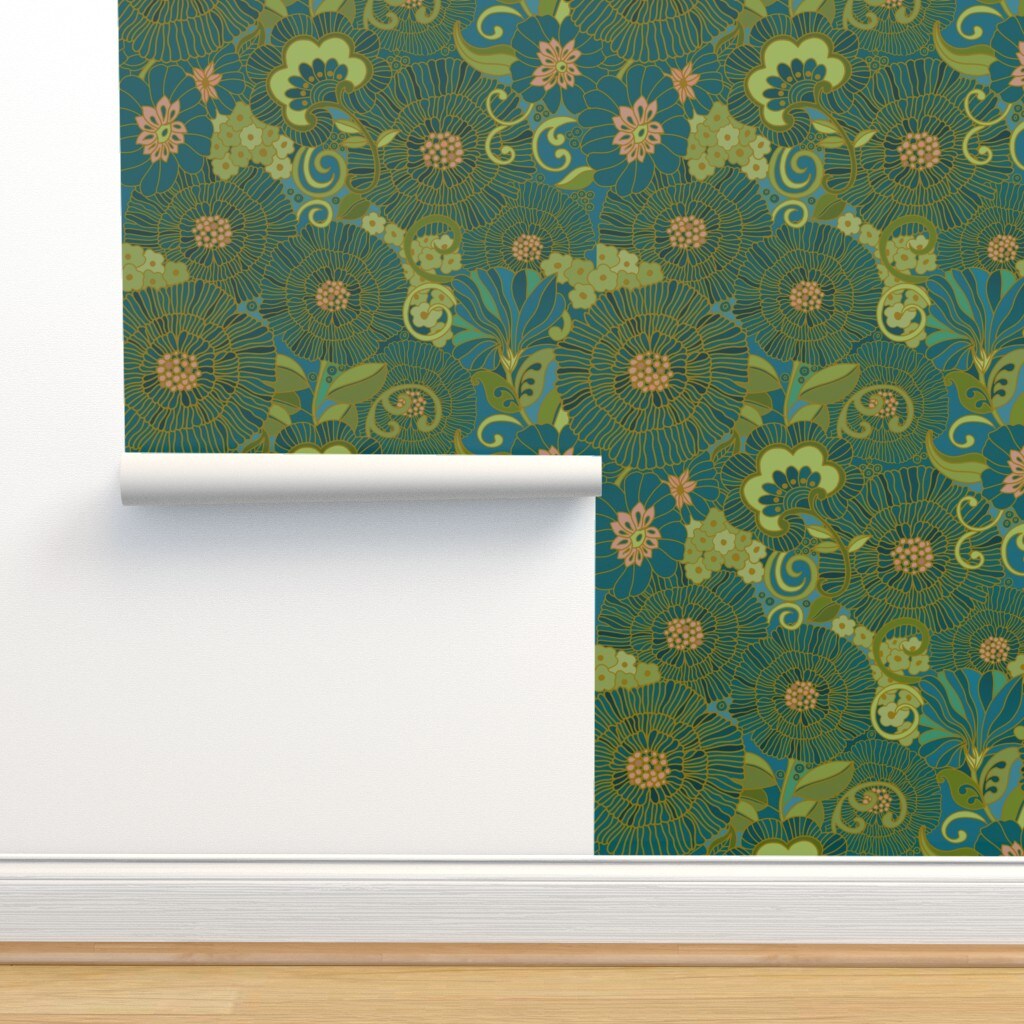 Vintage Style Floral Vintage Floral Retro Modern Kaleidoscope 1970S Large Scale Hawaii African Green Blue Yellow Custom Pre-pasted Wallpaper by Spoonflower Pre-Pasted Wallpaper 2FT Wide