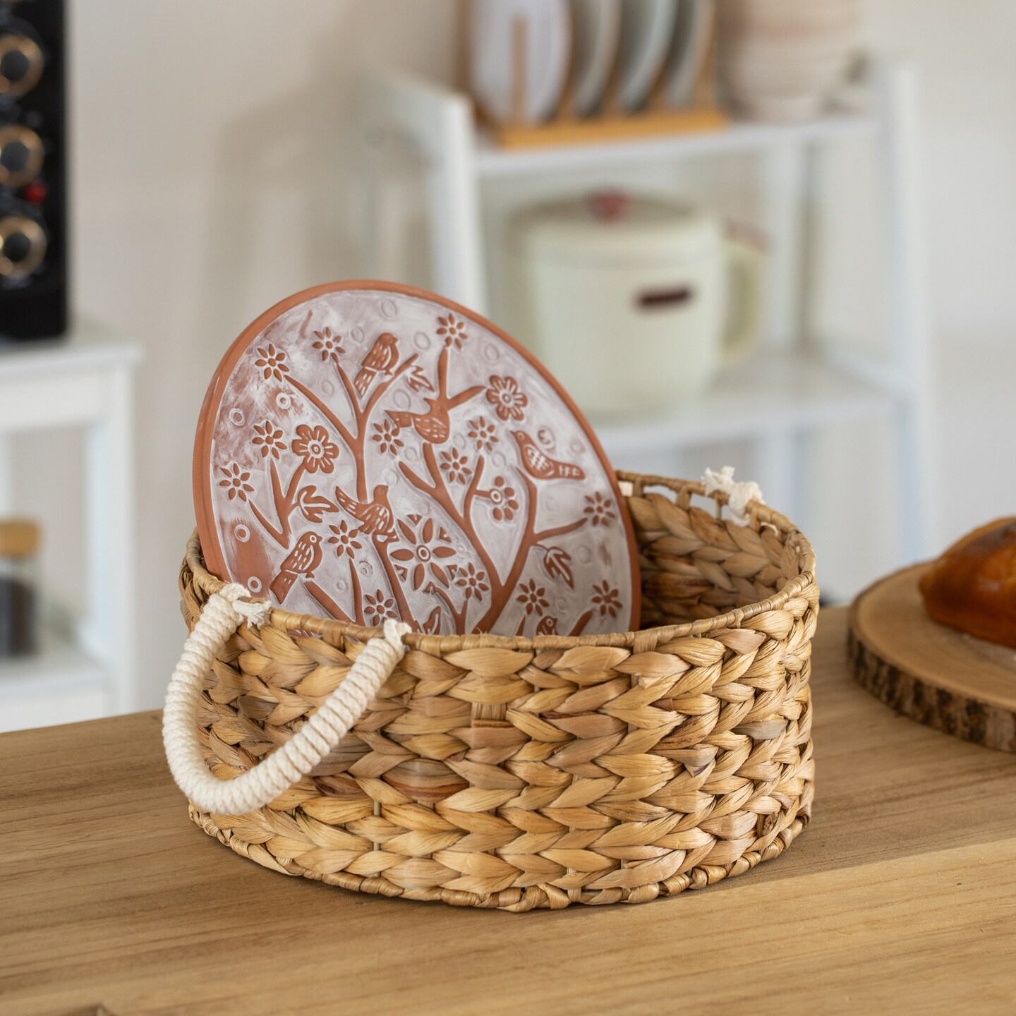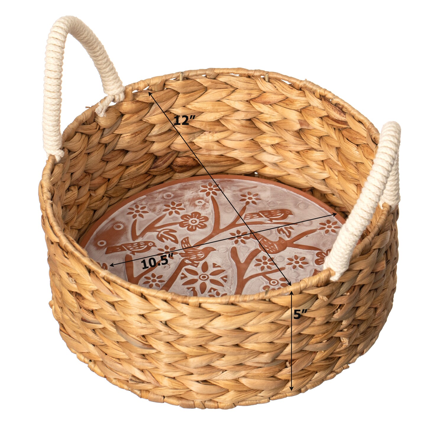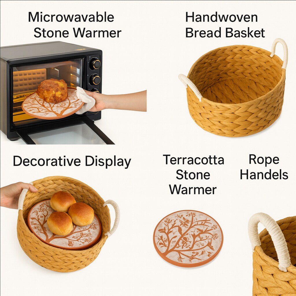 Vintiquewise Handwoven Wicker Bread Basket with Terracotta Stone Warmer & Rope Handles for Kitchen Dining Table & Home Party Use Ideal for Sourdough Bread Rolls Snacks & Baked Goods