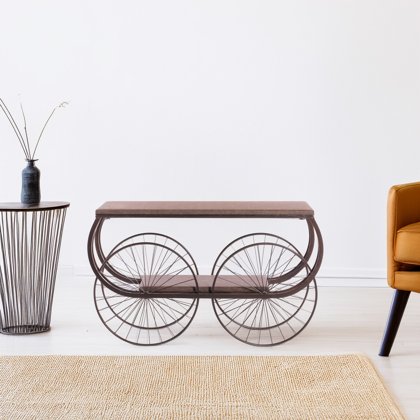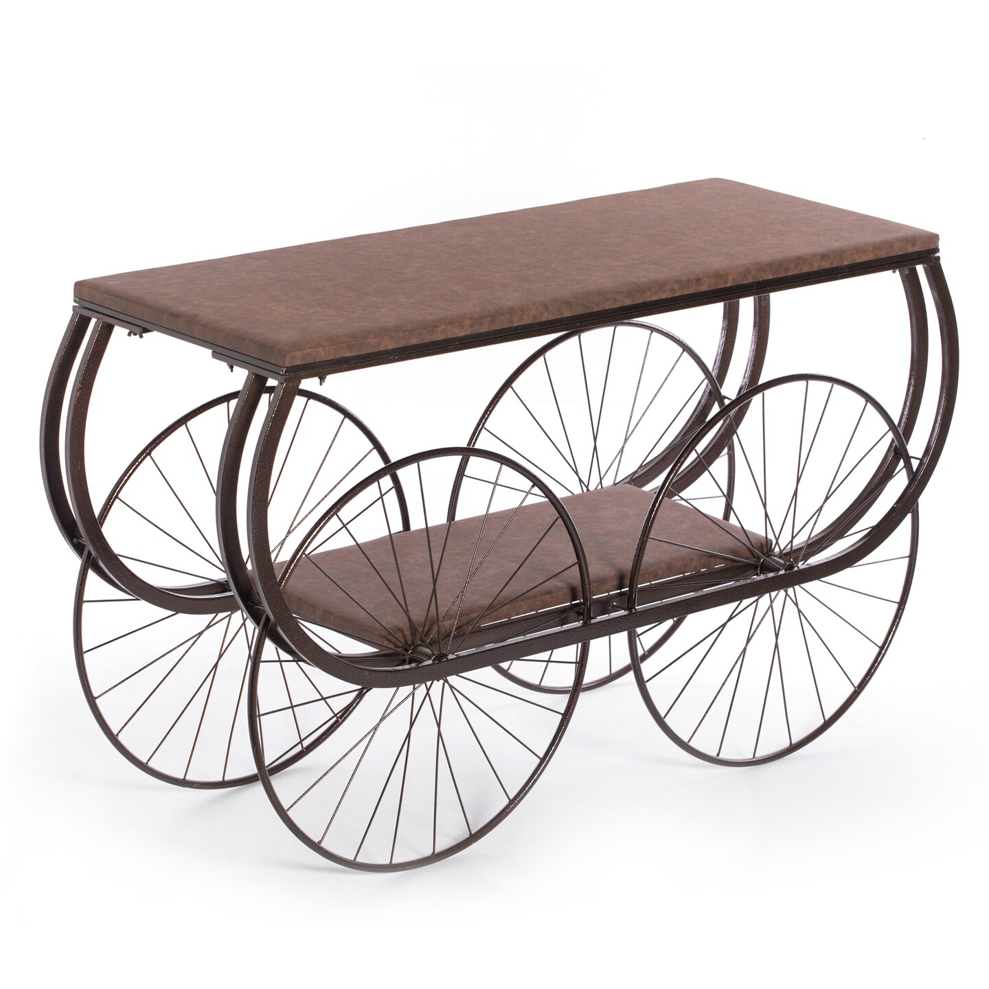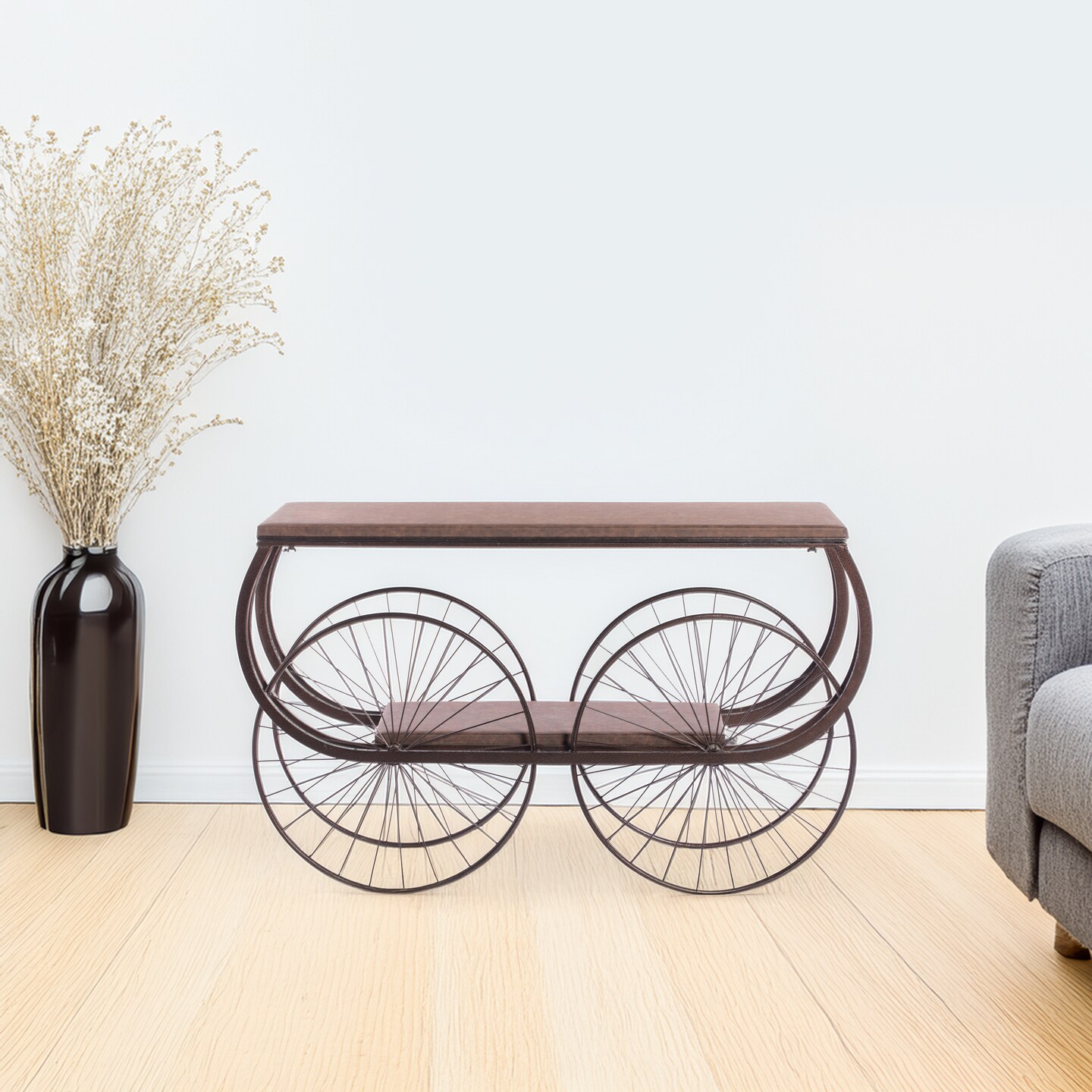 Vintiquewise Industrial Wagon Style Console Table Rustic Wood Top Large Spoke Metal Wheels & Lower Storage Shelf Vintage Accent Display Table for Hallway Entryway Dining Room Living Room or Home Bar