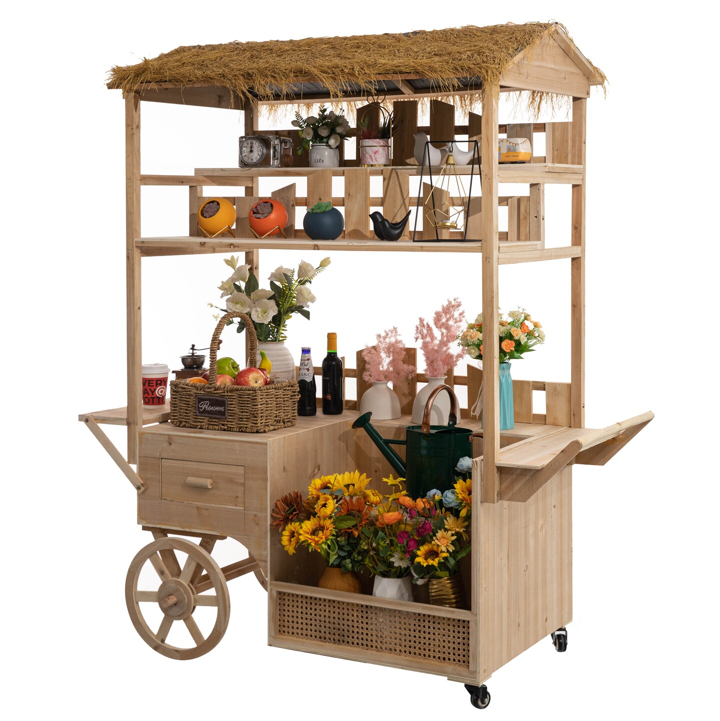 Vintiquewise Versatile Multi-Tier Shelves Wooden Rolling Cart - Perfect for Festival, Event Stand, Food Tasting Table, Garden Floral Display Rack, & Home Decor with Straw Roof and 2 Wood Wheels