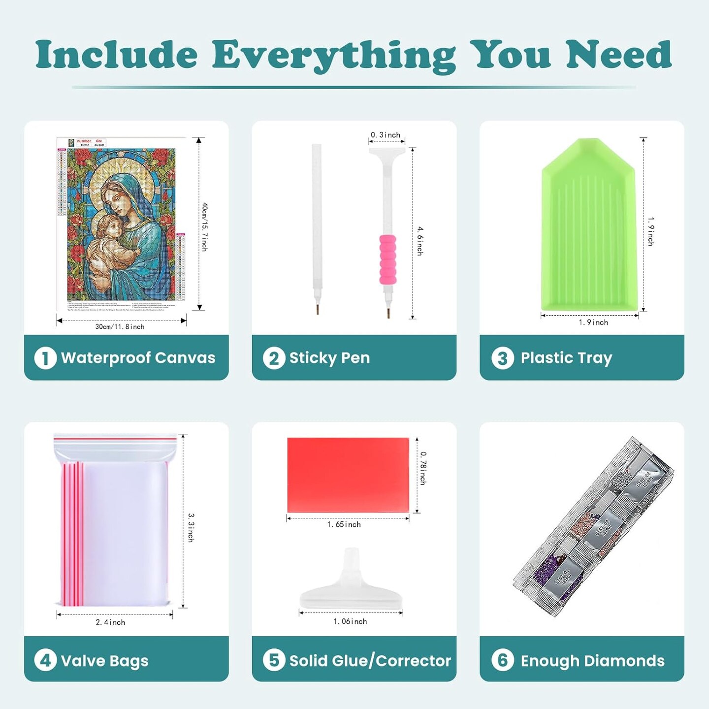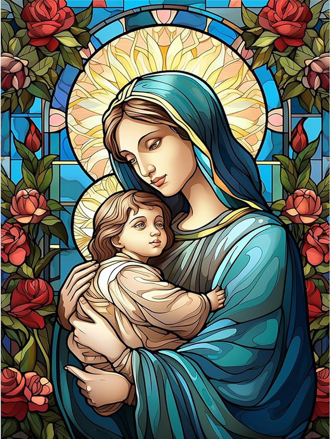 Virgin Mary 5D Diamond Painting Kit – DIY Stained Glass Jesus Art for Adults, 12x16 in, Round Full Drill Gem Art for Home Wall Decor