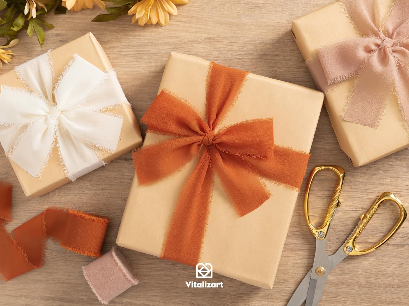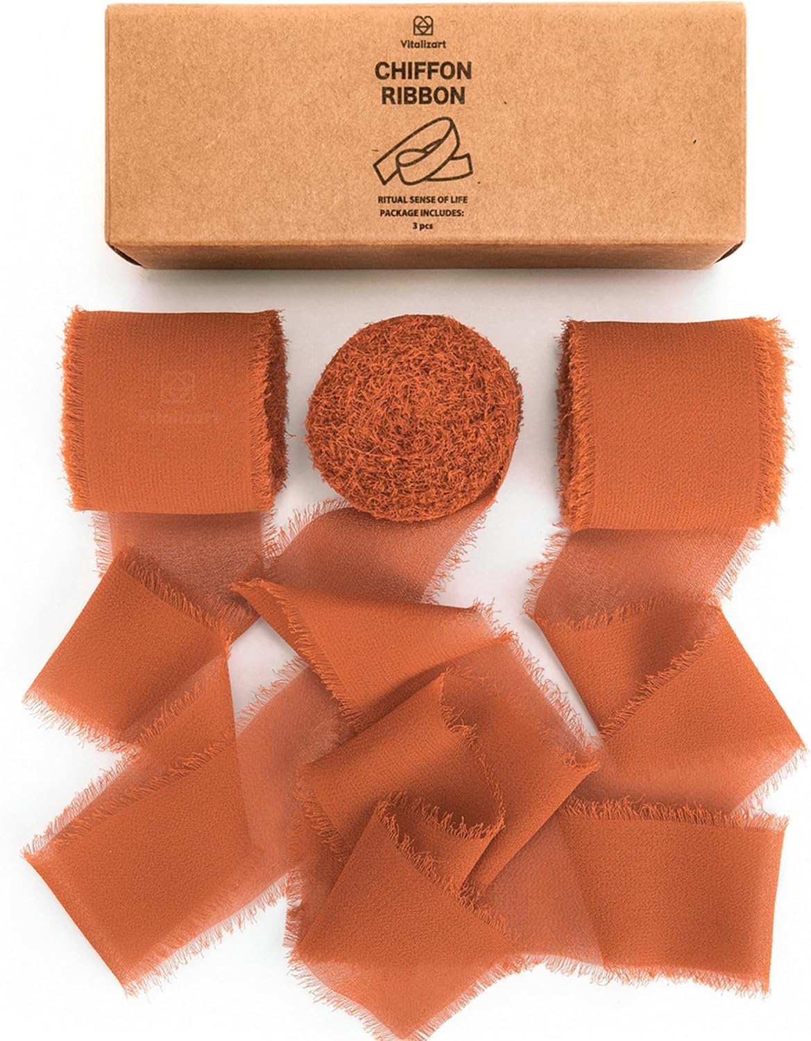 Vitalizart Terracotta Handmade Chiffon Silk Ribbon Fringe 3 Rolls 1.5" x 21 Yd Frayed Edges Ribbons for Wedding Invitations Bridal Bouquets Gifts Wrapping Crafts Holiday Decor